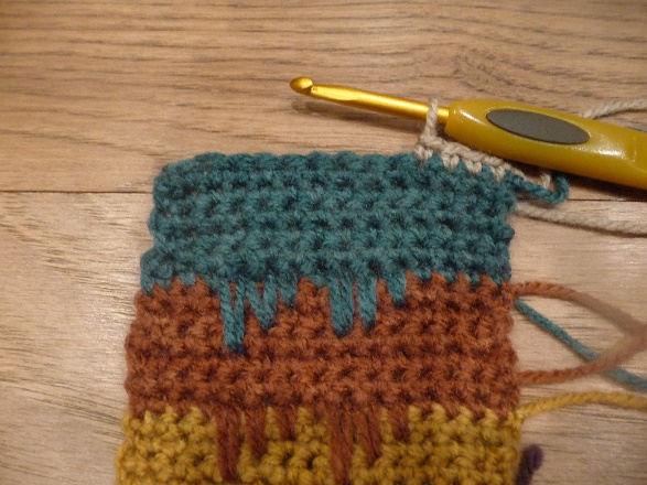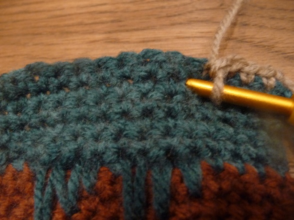 After row 10, fasten off yarn and switch to the next color. To switch colors, make a slipknot with the new color on the hook, insert hook into first st of row, yo, pull through.