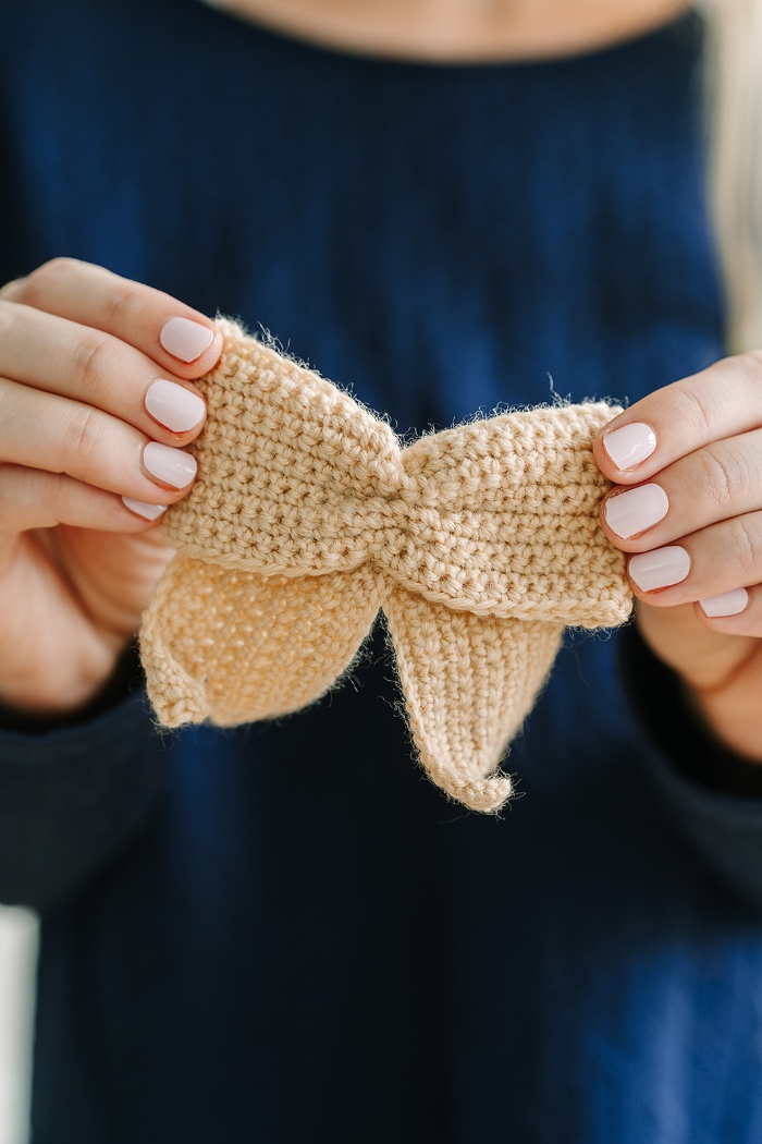 Pattern is worked flat in pieces, comprising the Bow and two Ribbon Ends, then assembled. Starting ch does not count as a st. Test placement of Ribbon Ends to find your favorite angle before sewing in place.