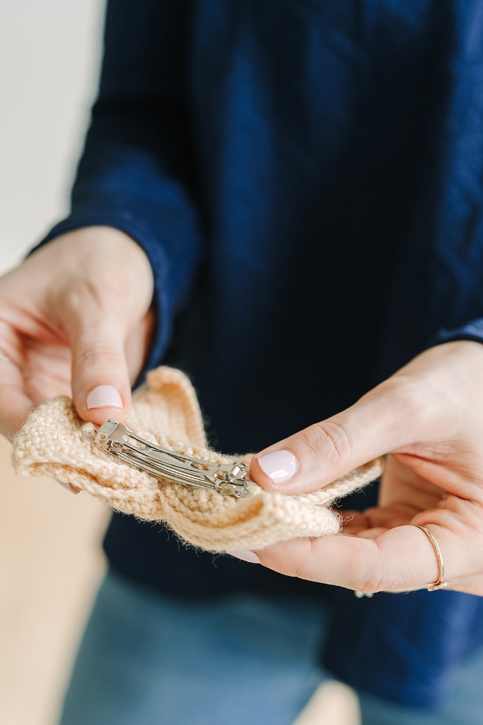 Turn over. One at a time, place ribbon ends diagonally, overlapping central seam slightly at lower edge. Sew in place, then sew on barrette close to center.