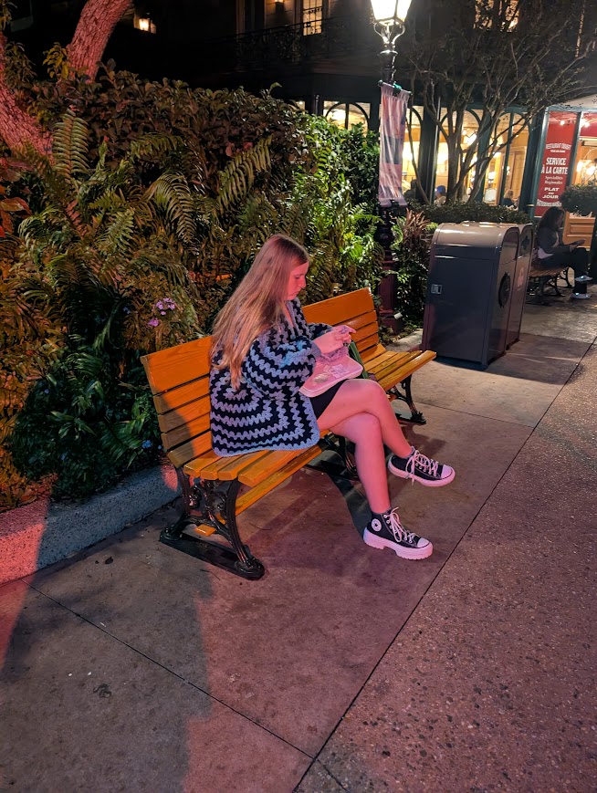 I think some of my favorite crochet projects to make are wearables (at least for now my hyper fixations are ever changing ????). Wearables are basically clothing but crocheted. I just finished my first cardigan last month and am now making one for my mom. I have also made beanies, headbands, and even things for our dog to wear. I also love doing projects where the pattern keeps repeating and there isn’t any counting involved because then I can watch tv or have conversations with people. I recently walked the World Showcase at EPCOT crocheting a granny square.