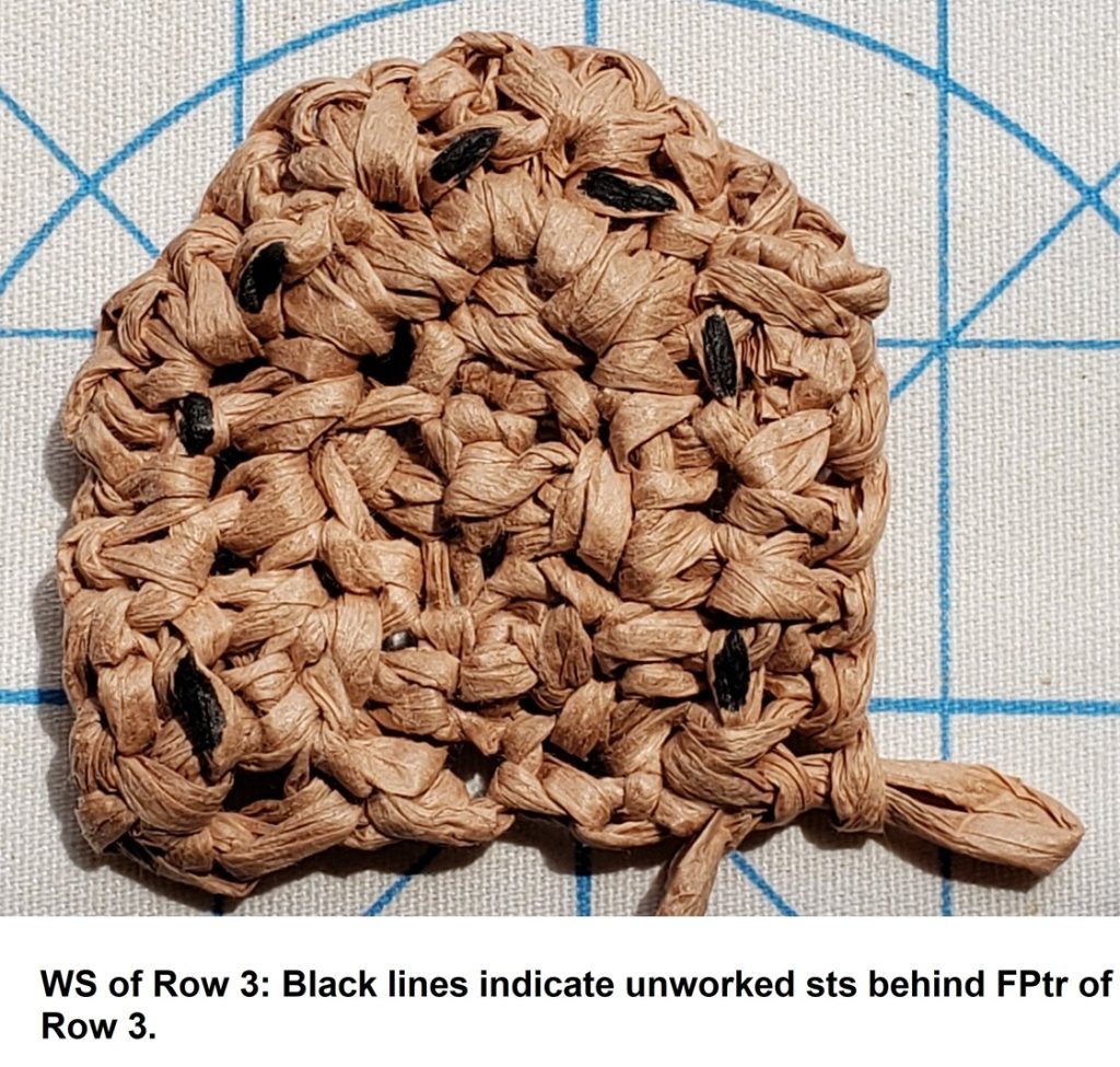 Row 3: Ch 1, sc in first st, FPtr (see Special Stitches) around post of first marked dc in row 1 (see Photo 2), sc in next 2 sts, FPtr around post of next marked dc in row 1, *2 sc in next st, FPtr around next marked dc, *[2 sc in next st, FPtr around same place where last FPdc was made] twice, rep from * to * once, sc in next 2 sts, FPtr around next marked dc, sc in last st, turn. (See Photo 3 which shows sk st directly behind each of fptr sts made.) (7 FPtr, 14 sc)