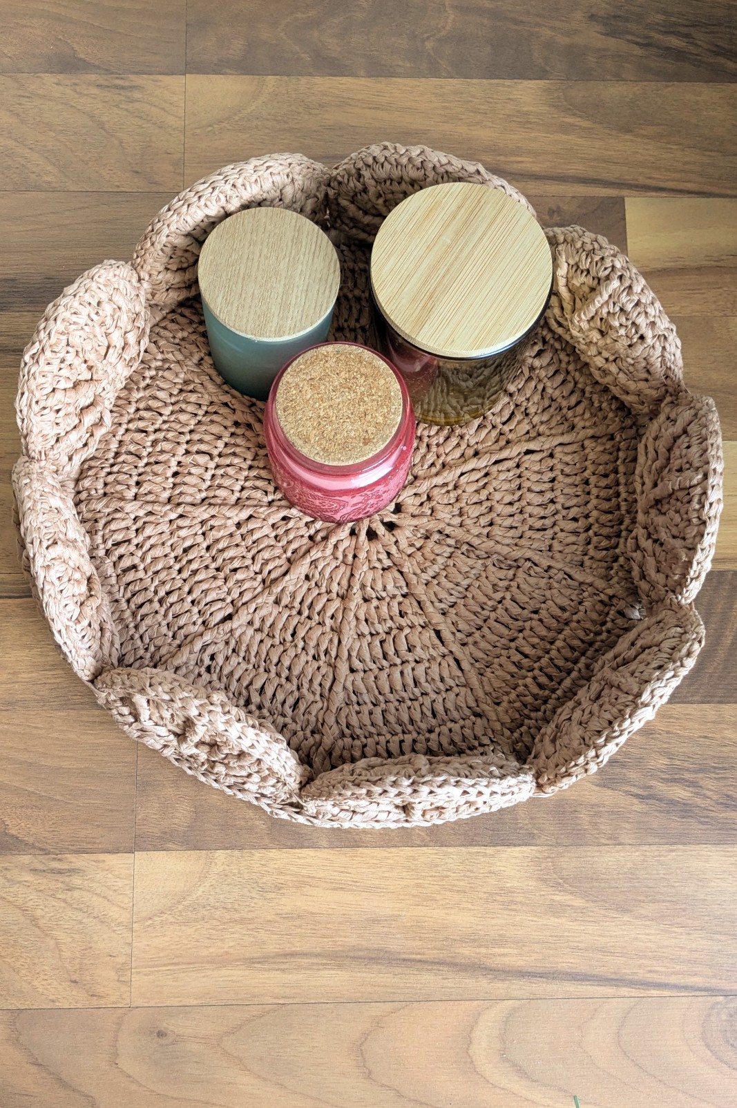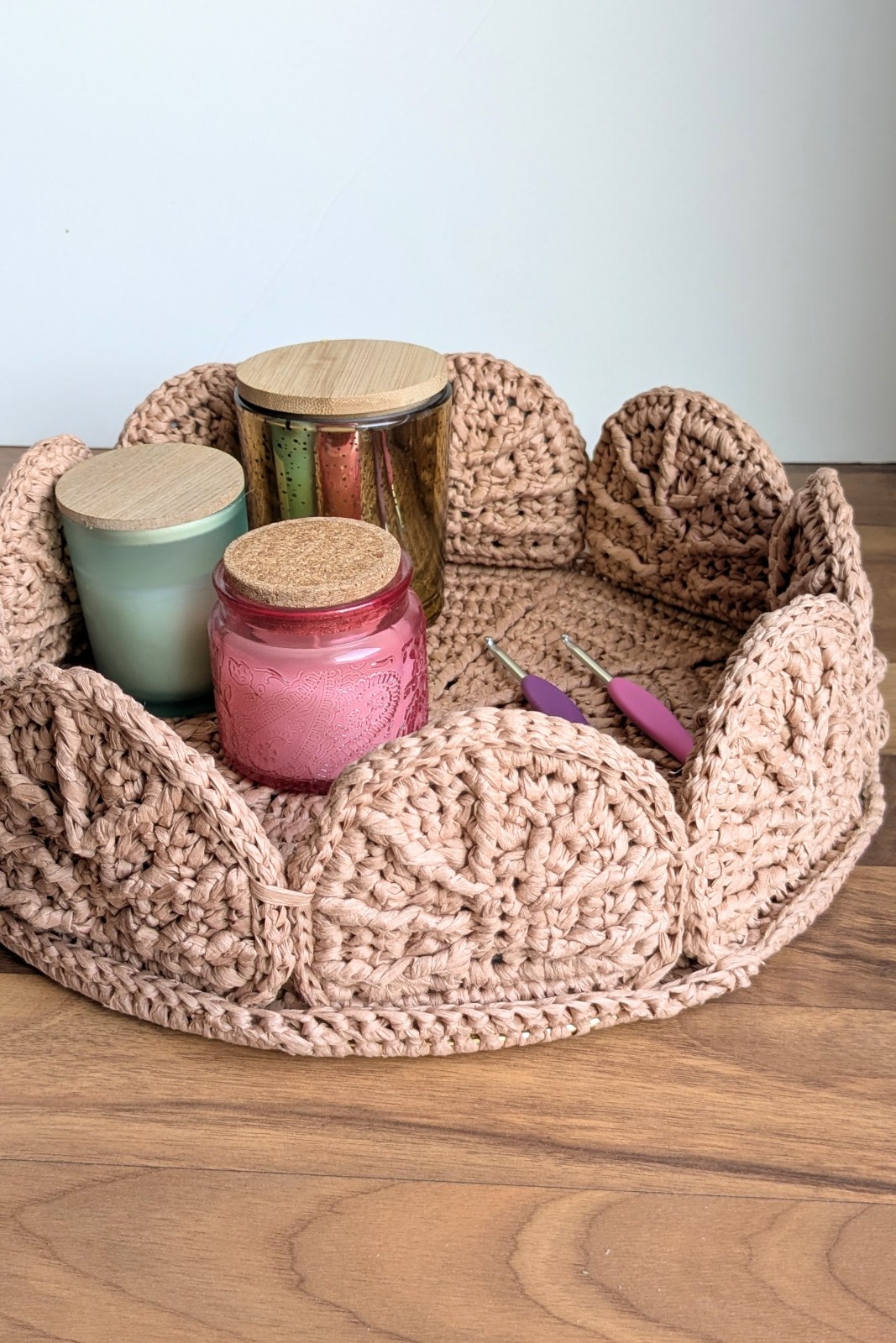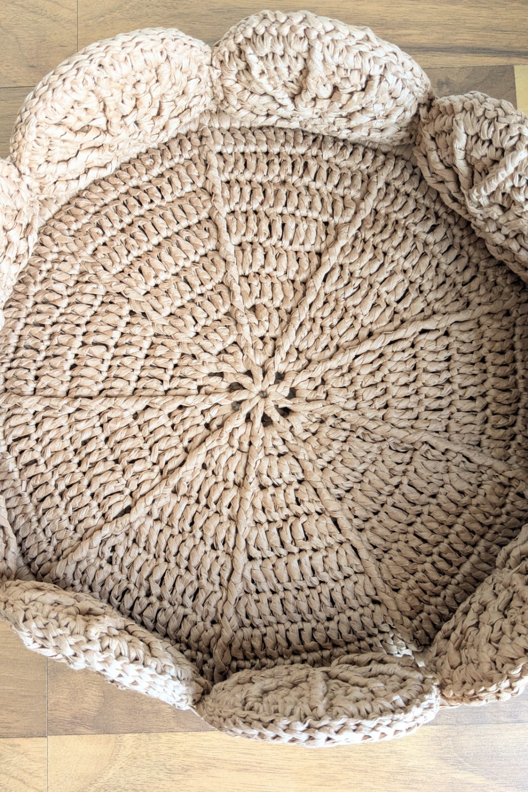 Designer suggests using Clover Amour ergonomic crochet hooks to be kind to one’s hands while working the dense stitches needed for this sturdy basket .