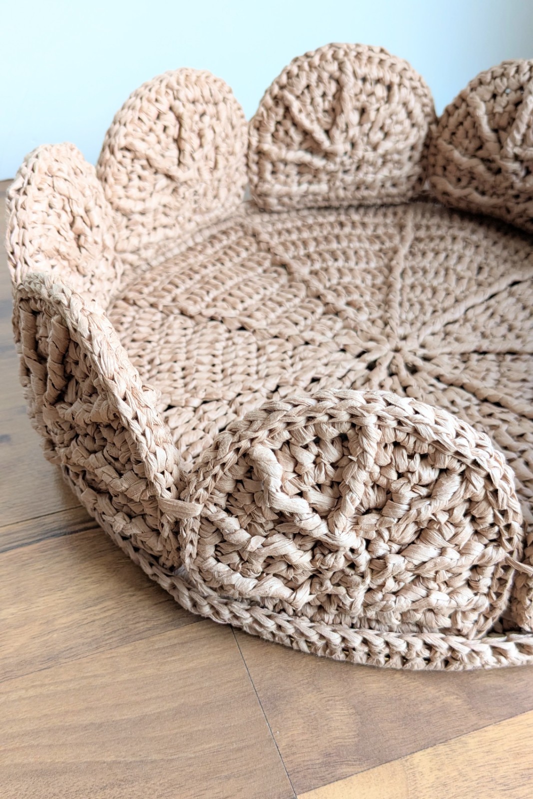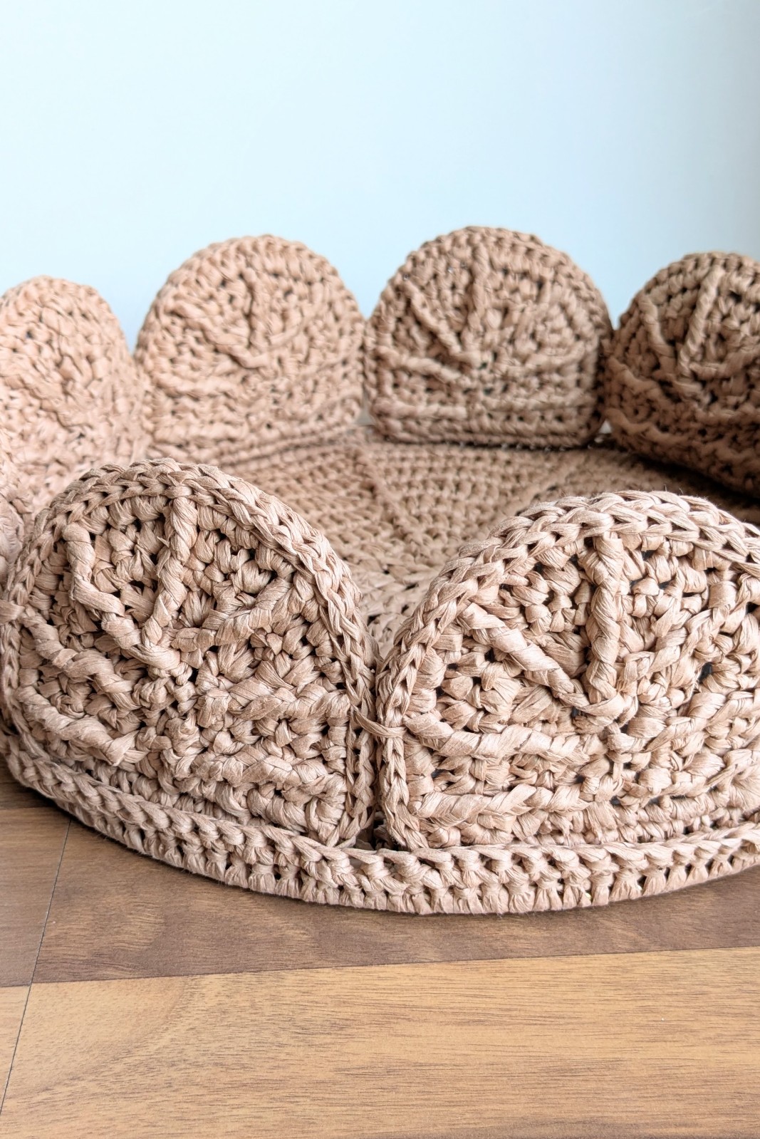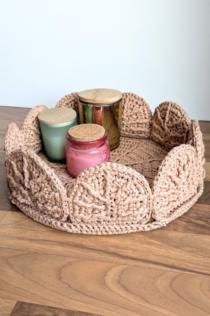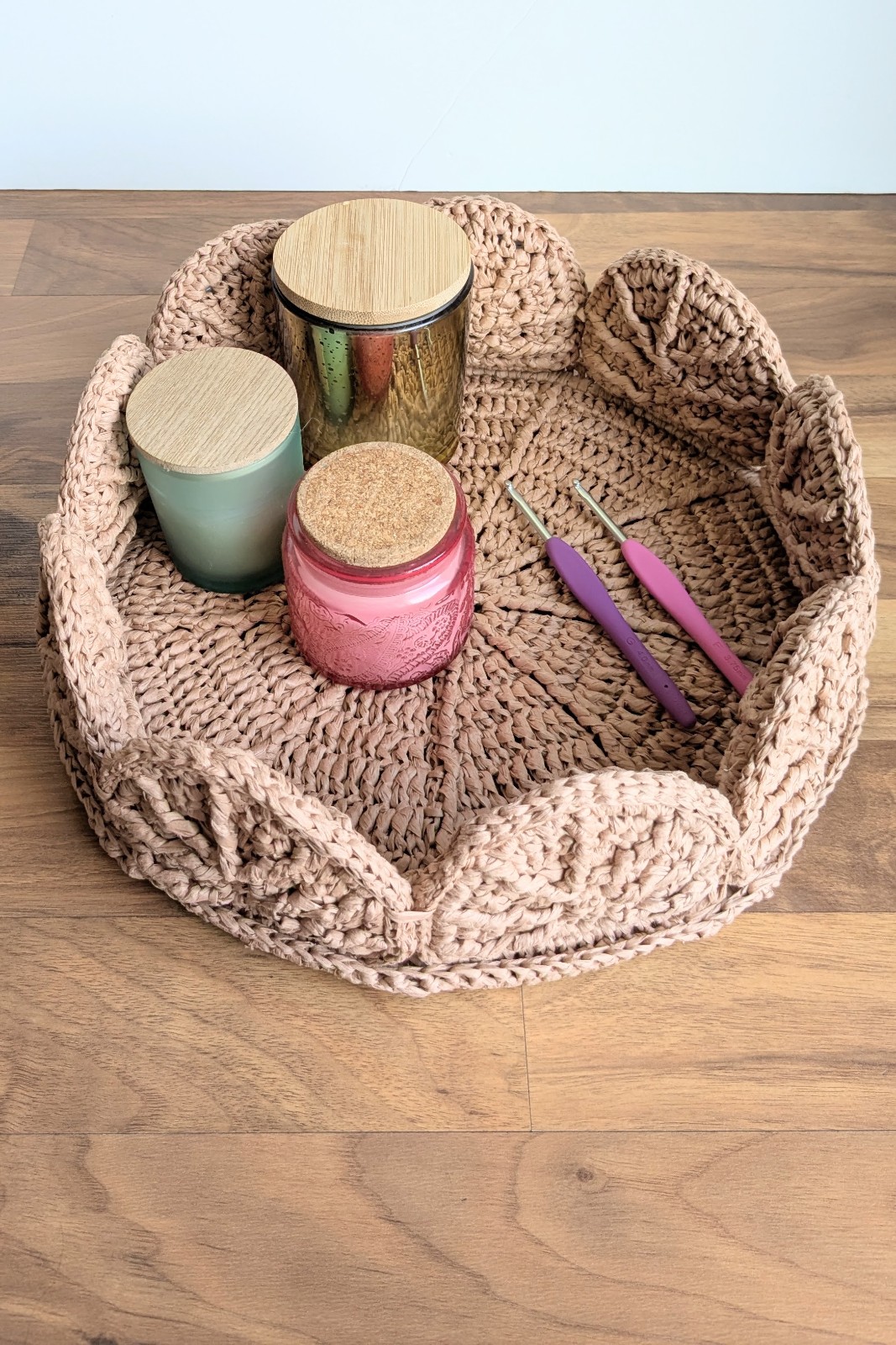 Designer suggests using Clover Amour ergonomic crochet hooks to be kind to one’s hands while working the dense stitches needed for this sturdy basket .