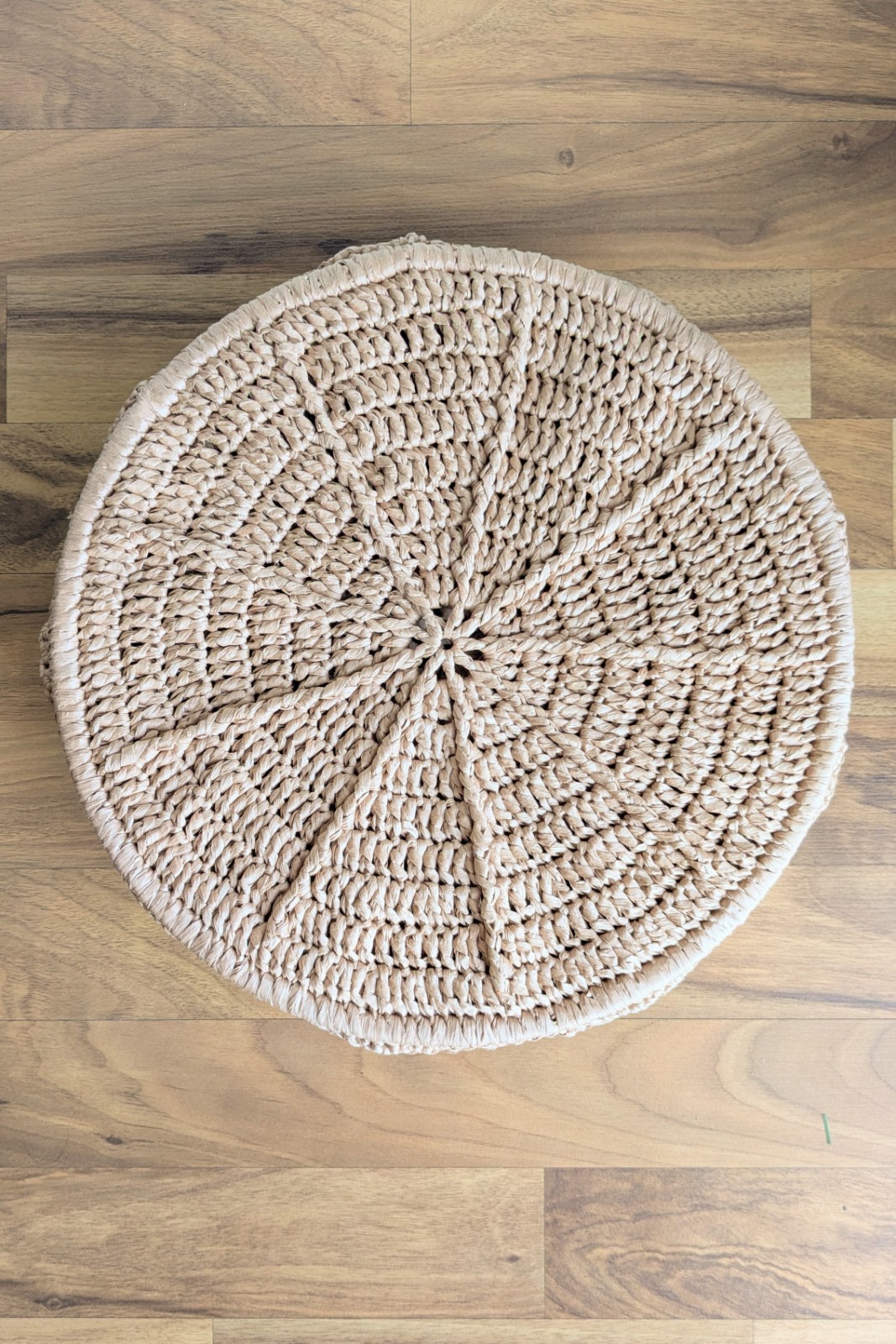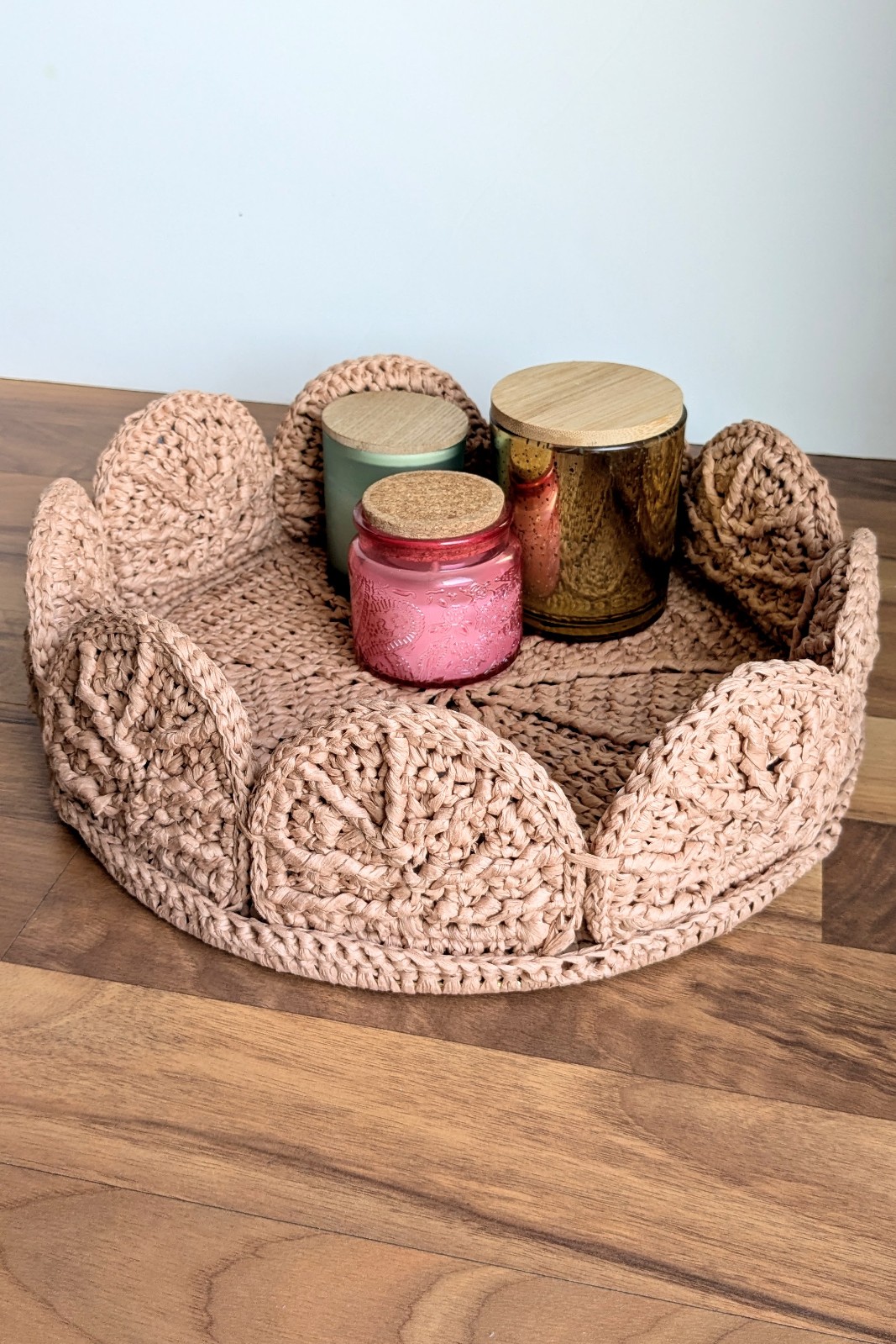 Using photo as stitch placement guide, with outside perimeter of Tray motifs RS facing use raffia and tapestry needle to sew one straight st to join side edges of motifs or where desired. Knot securely and weave in ends between layers of motifs.