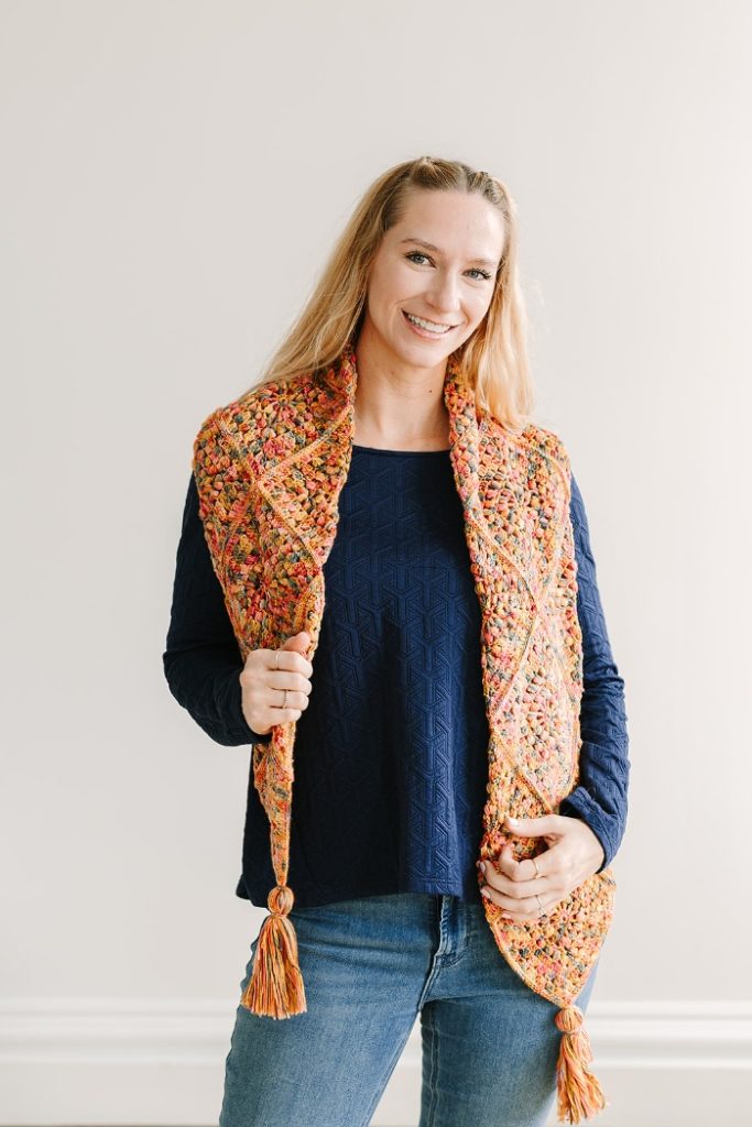 Trim the ends of the tassel to achieve uniform length. Use the tie-off yarns at the top to attach the tassel to the chain spaces at the tips of the shawls.