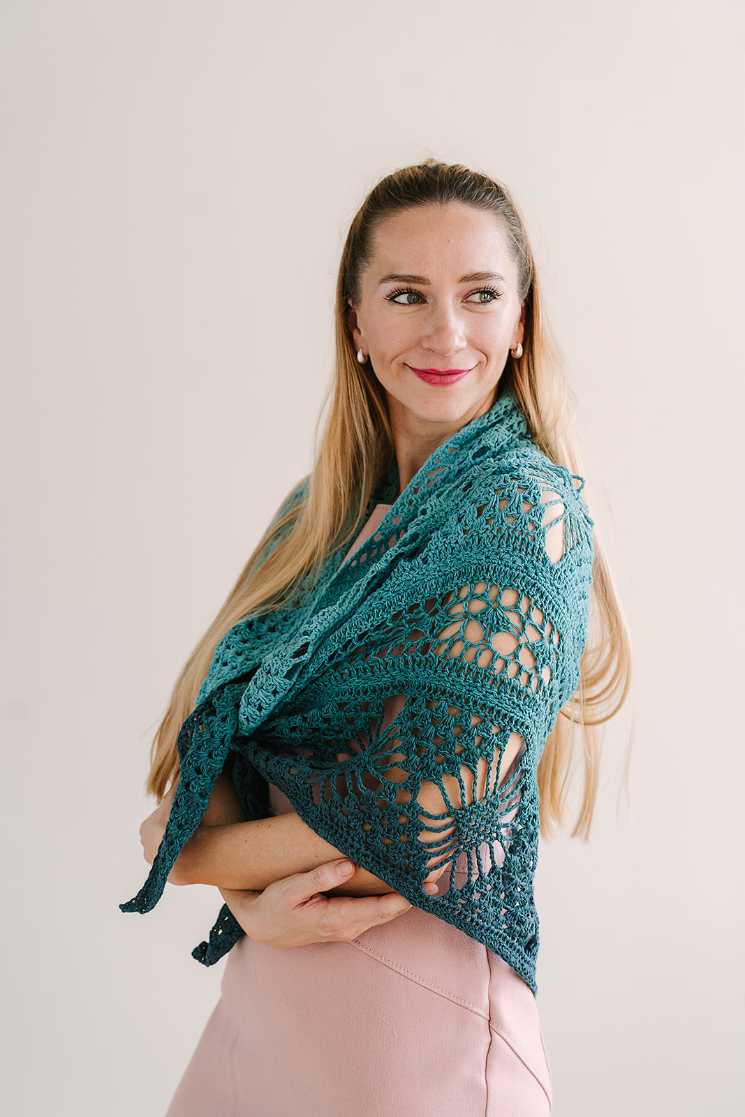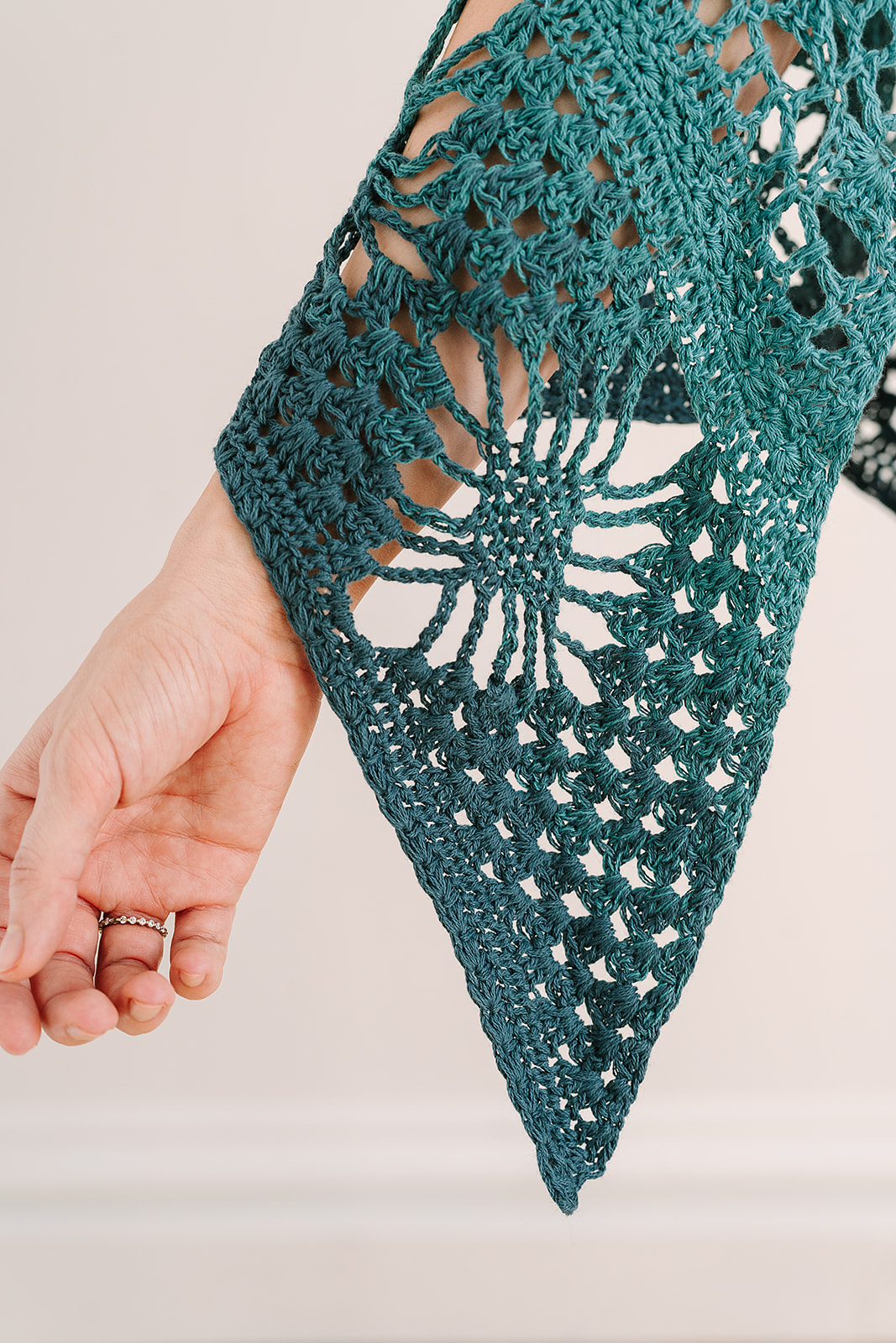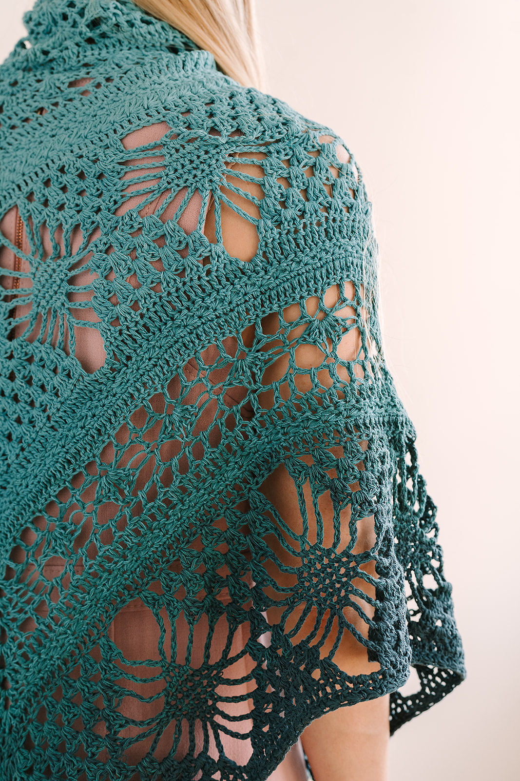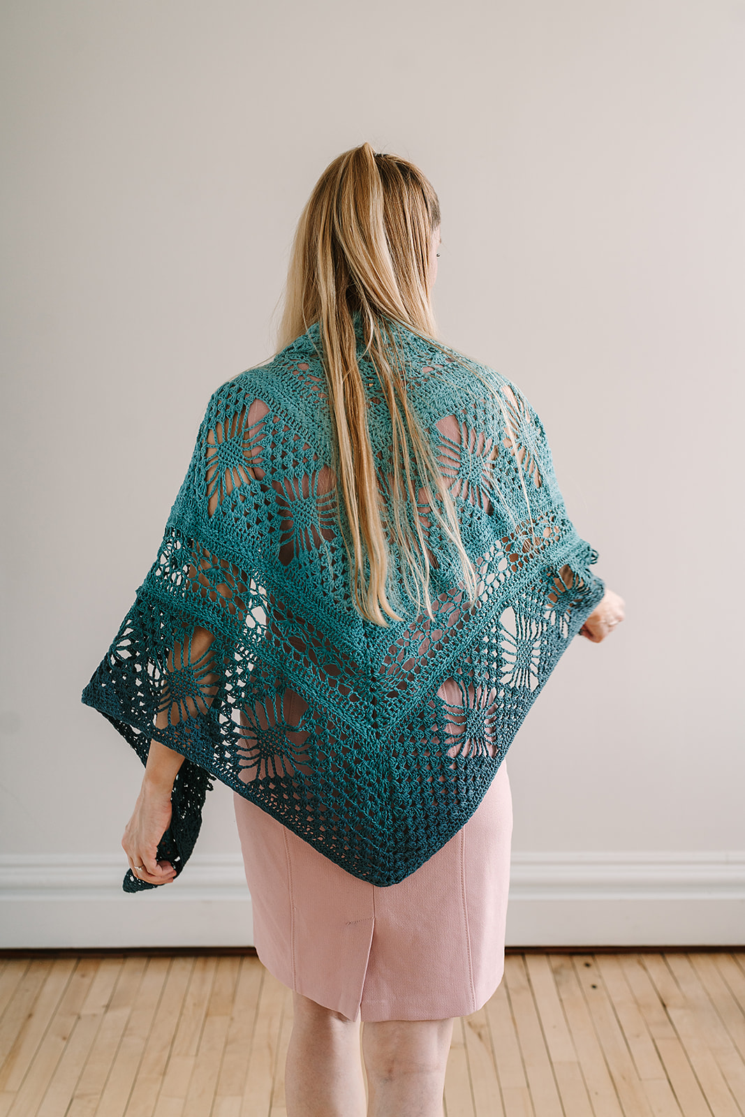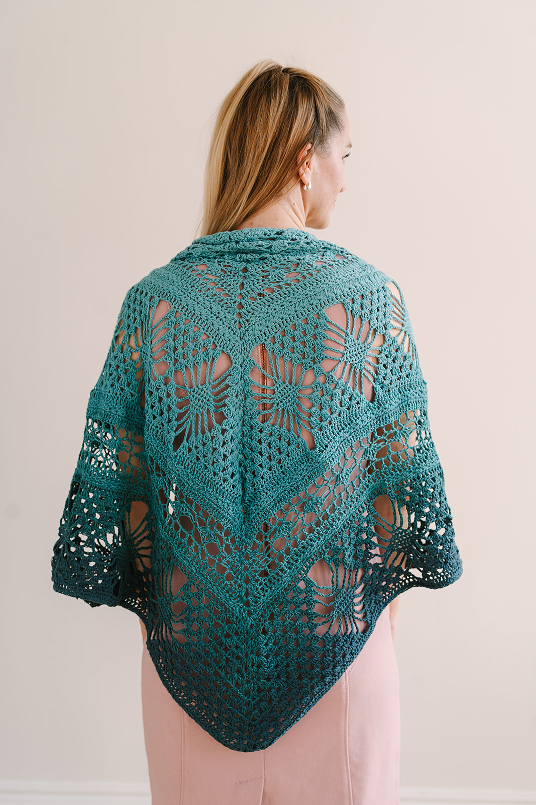 Bring traditional crochet to life with a modern twist in the Indigolite Diamonds Shawl. Classic granny-style stitches combine beautifully with open, diamond-shaped lace motifs to create a delicate, airy layering piece. Designed to be lightweight and versatile, this shawl can also be worn as a scarf. The yarn’s subtle ombre effect transitions from a light hue at the top to a deeper shade at the point, enhancing the elegant texture and flow of the design.