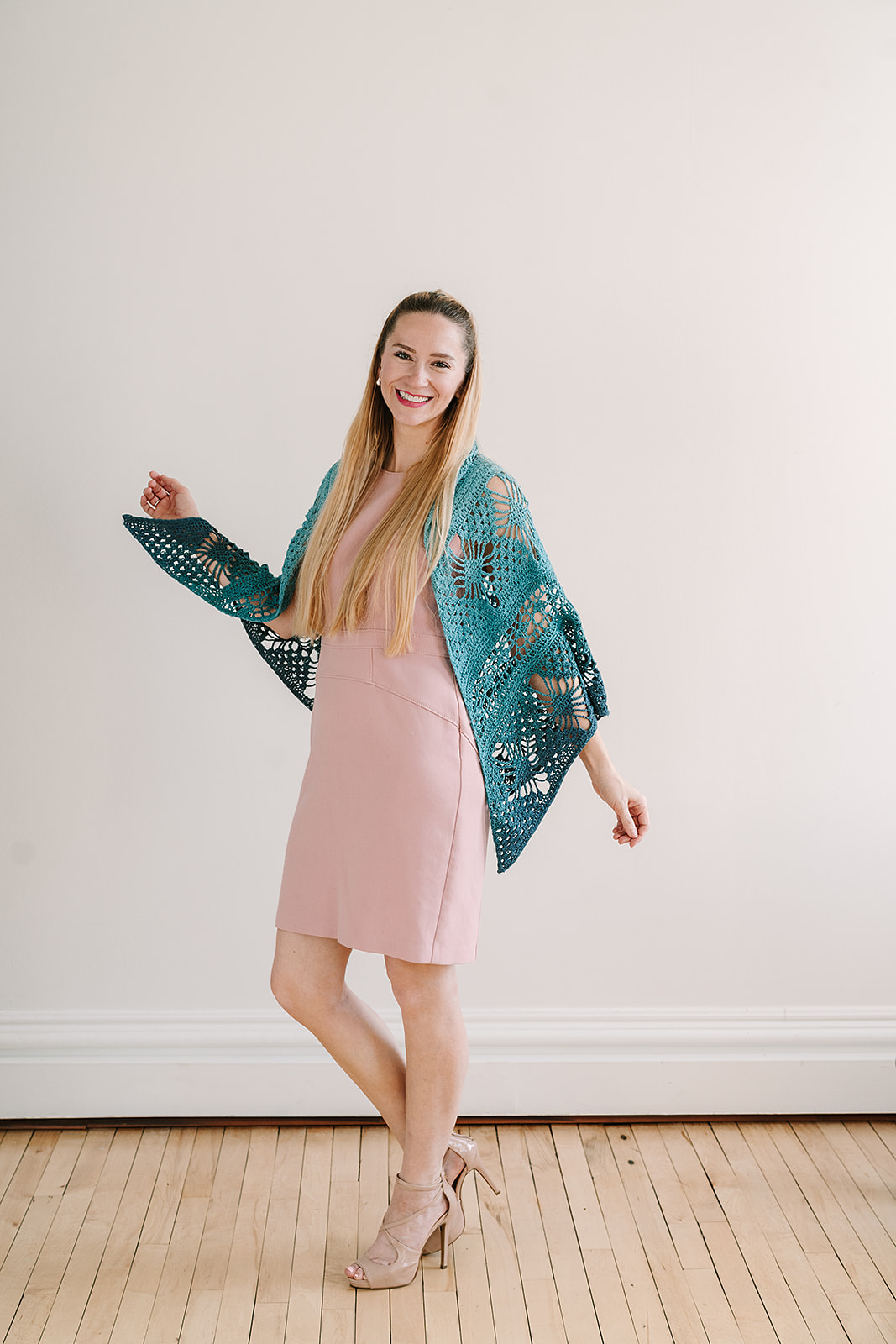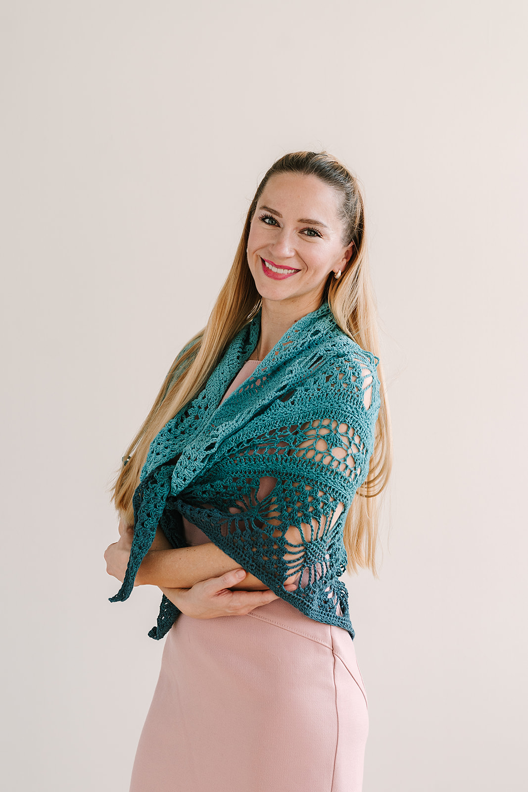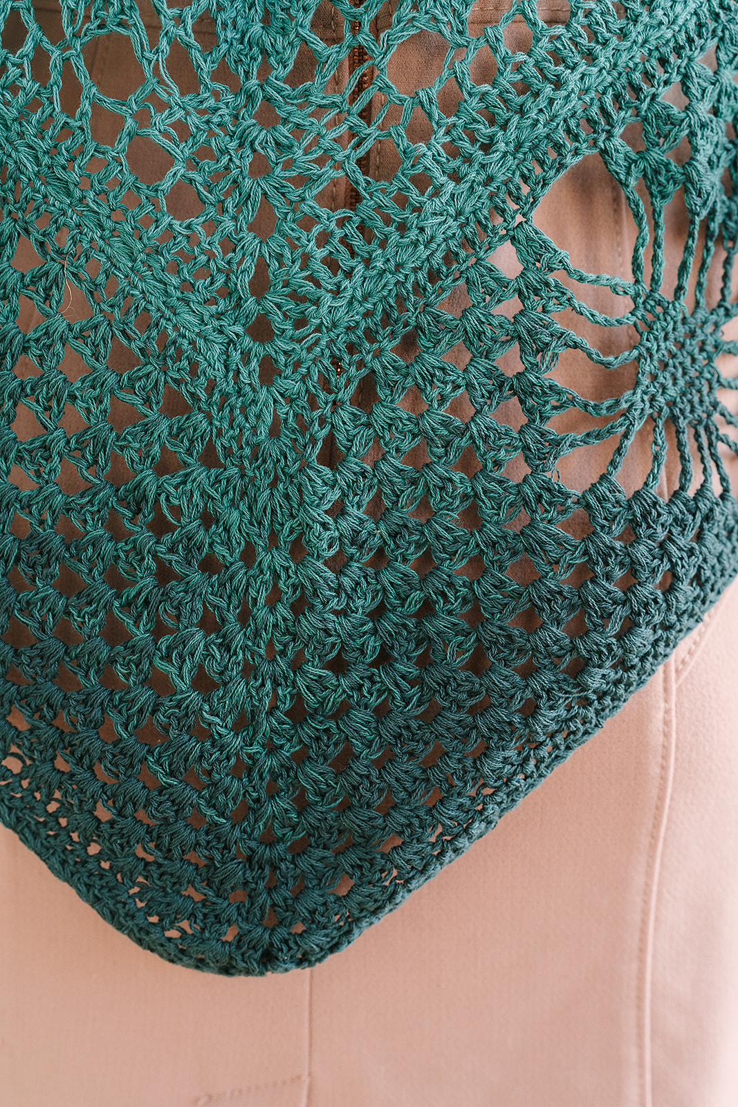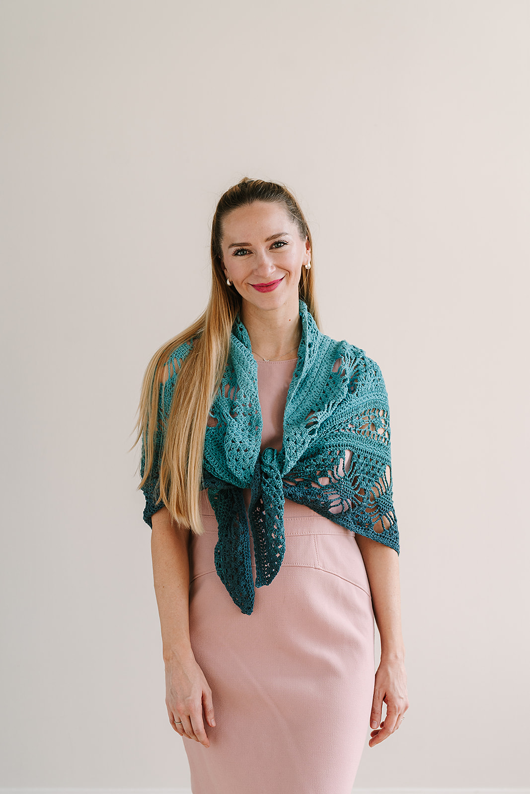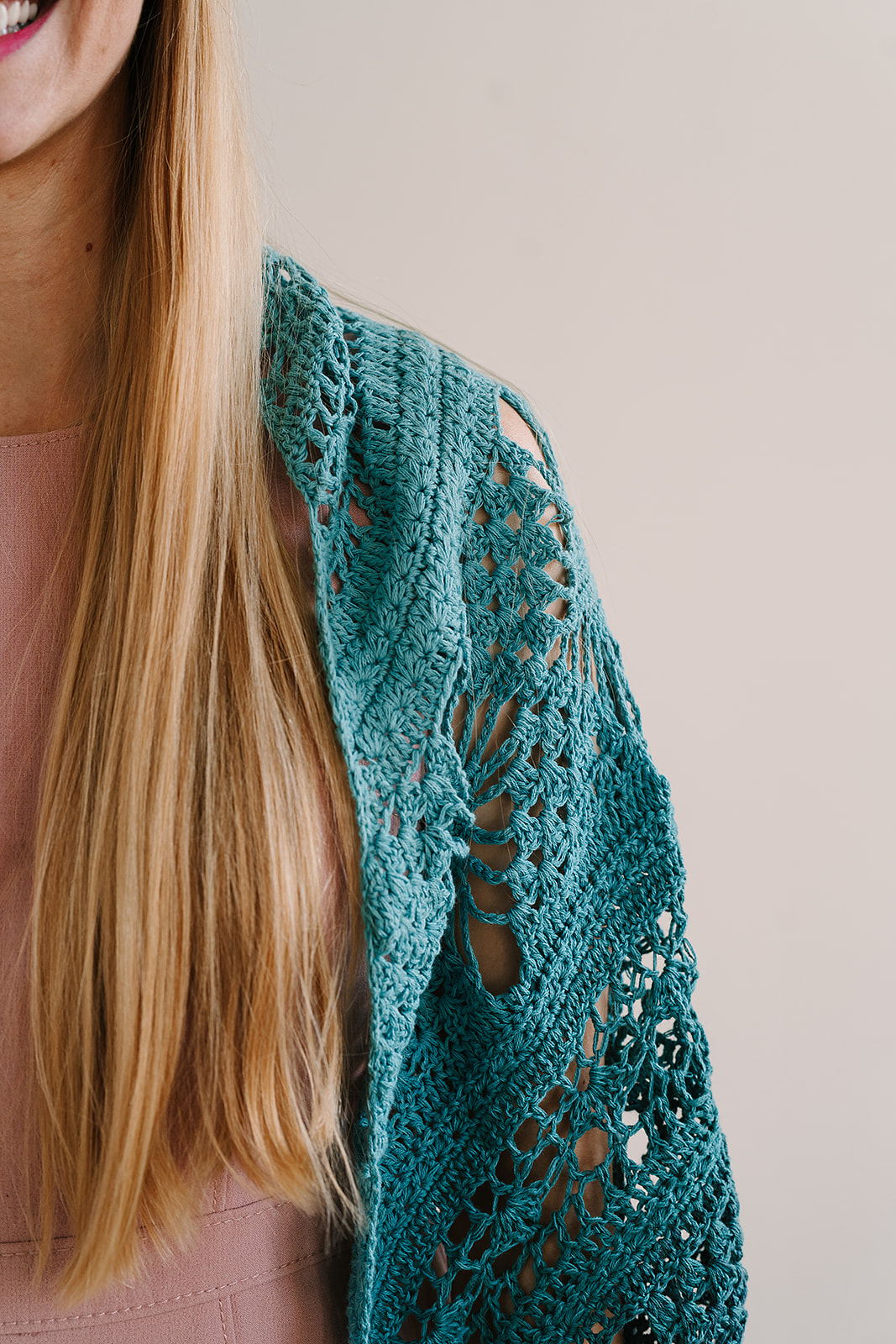 Bring traditional crochet to life with a modern twist in the Indigolite Diamonds Shawl. Classic granny-style stitches combine beautifully with open, diamond-shaped lace motifs to create a delicate, airy layering piece. Designed to be lightweight and versatile, this shawl can also be worn as a scarf. The yarn’s subtle ombre effect transitions from a light hue at the top to a deeper shade at the point, enhancing the elegant texture and flow of the design.