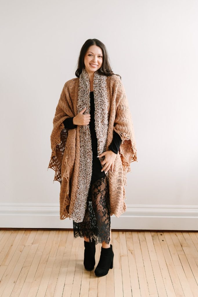 Bring the glamour of a lavish fur coat to your next winter gathering with the Mocha Luxe Ruana. This stunning statement piece makes a big impact with secretly easy construction! The chevron stitch design is worked with simple stitches, making it a relaxing project to enjoy while watching TV or listening to an audiobook. A faux fur collar and beaded edging elevate the piece with the perfect touch of luxury.