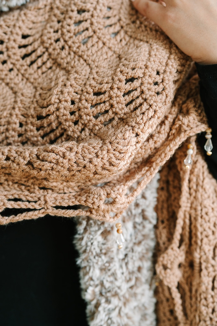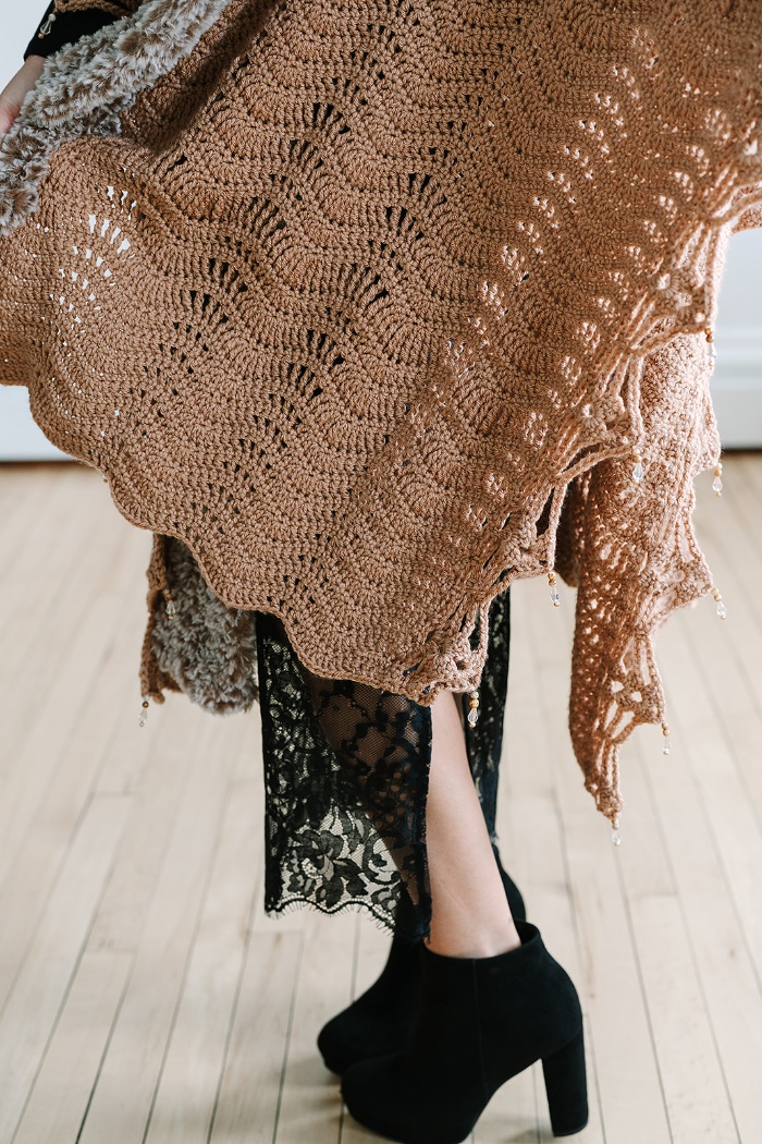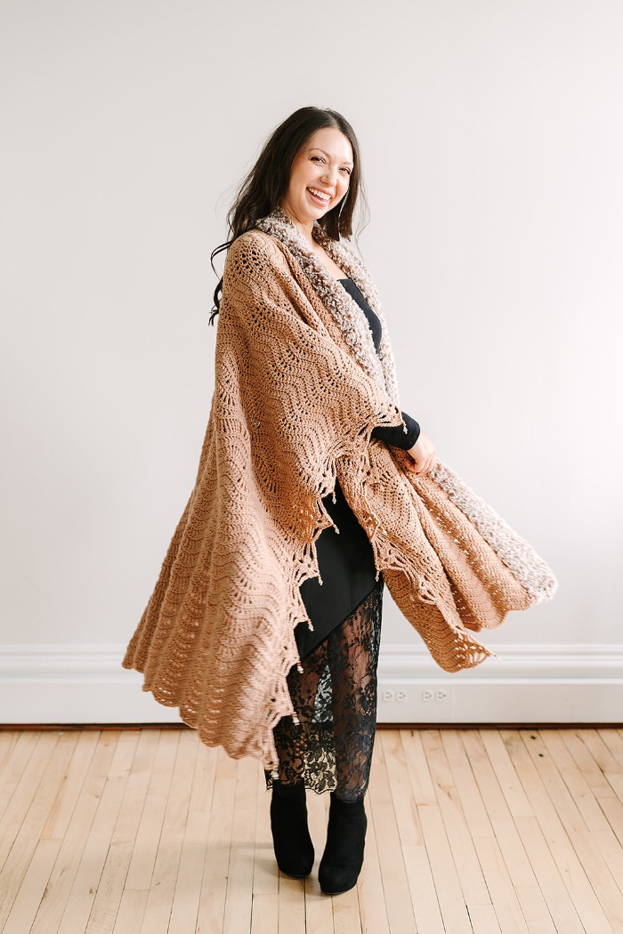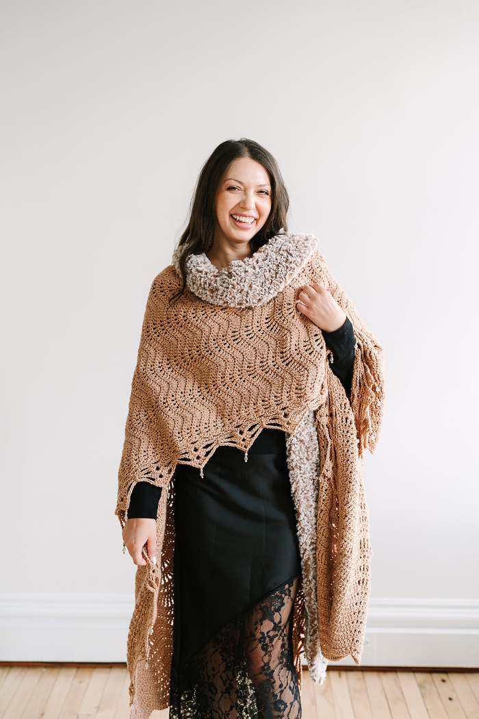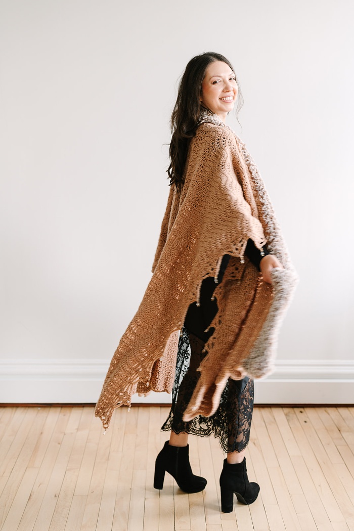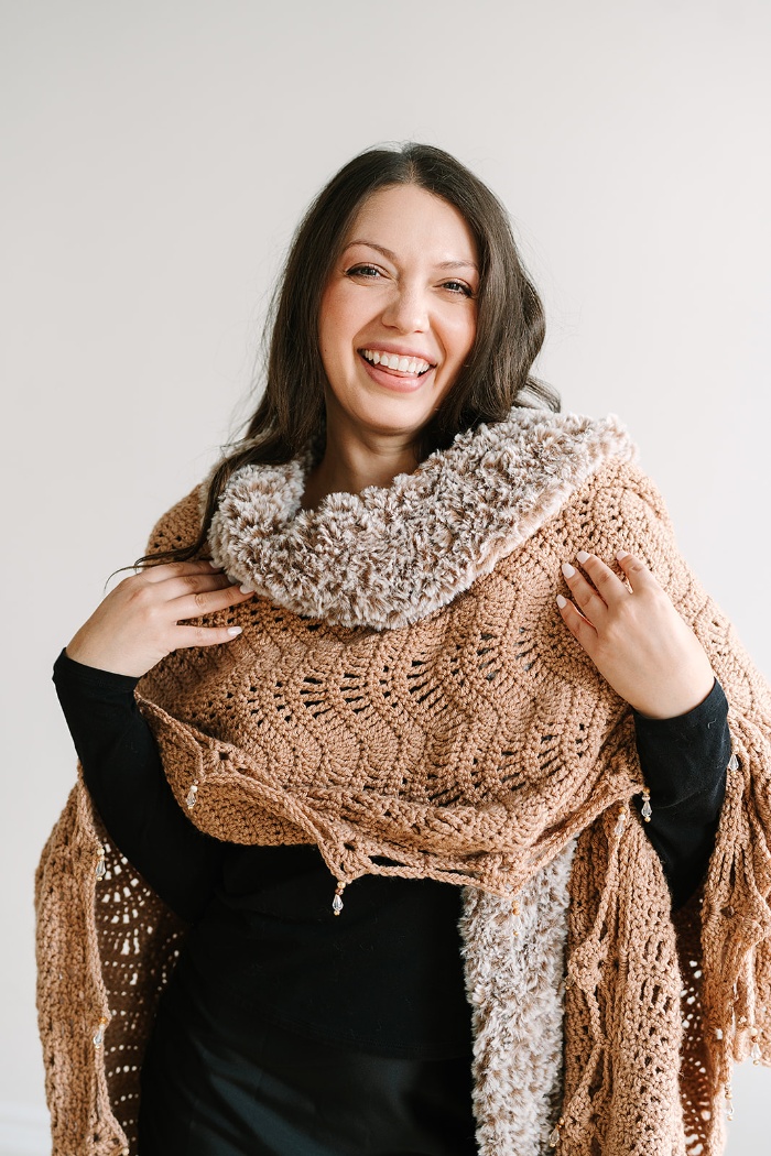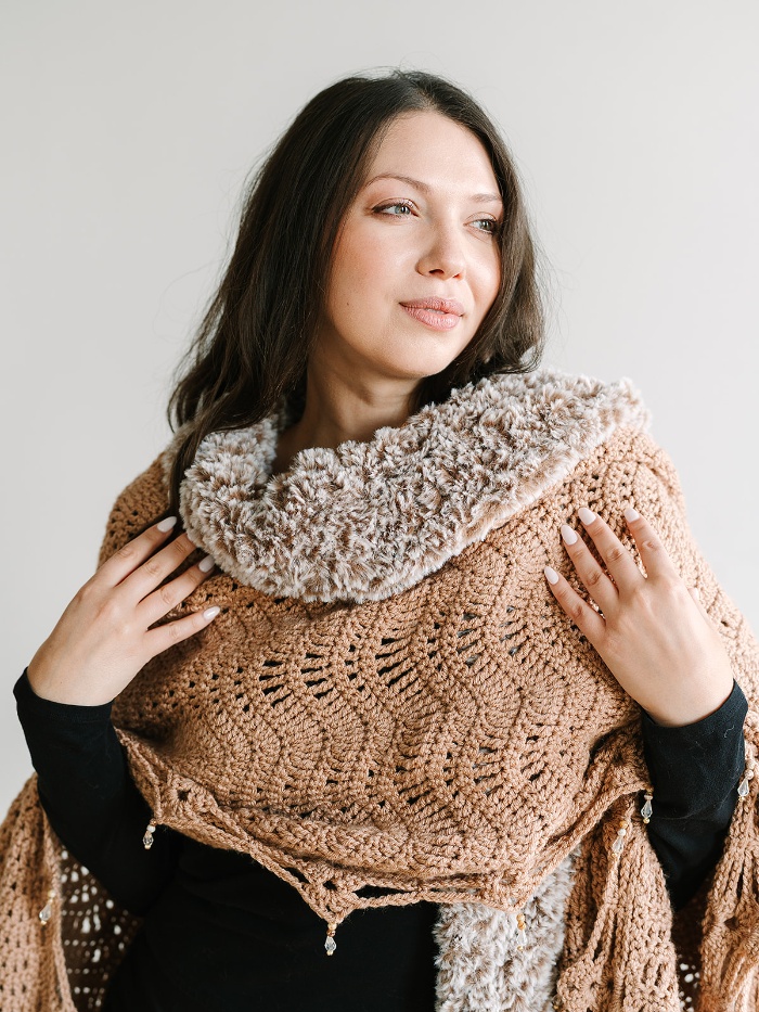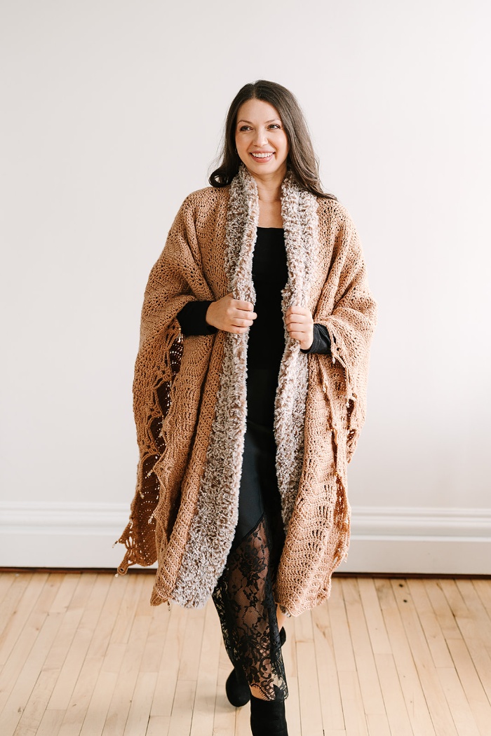 Bring the glamour of a lavish fur coat to your next winter gathering with the Mocha Luxe Ruana. This stunning statement piece makes a big impact with secretly easy construction! The chevron stitch design is worked with simple stitches, making it a relaxing project to enjoy while watching TV or listening to an audiobook. A faux fur collar and beaded edging elevate the piece with the perfect touch of luxury.