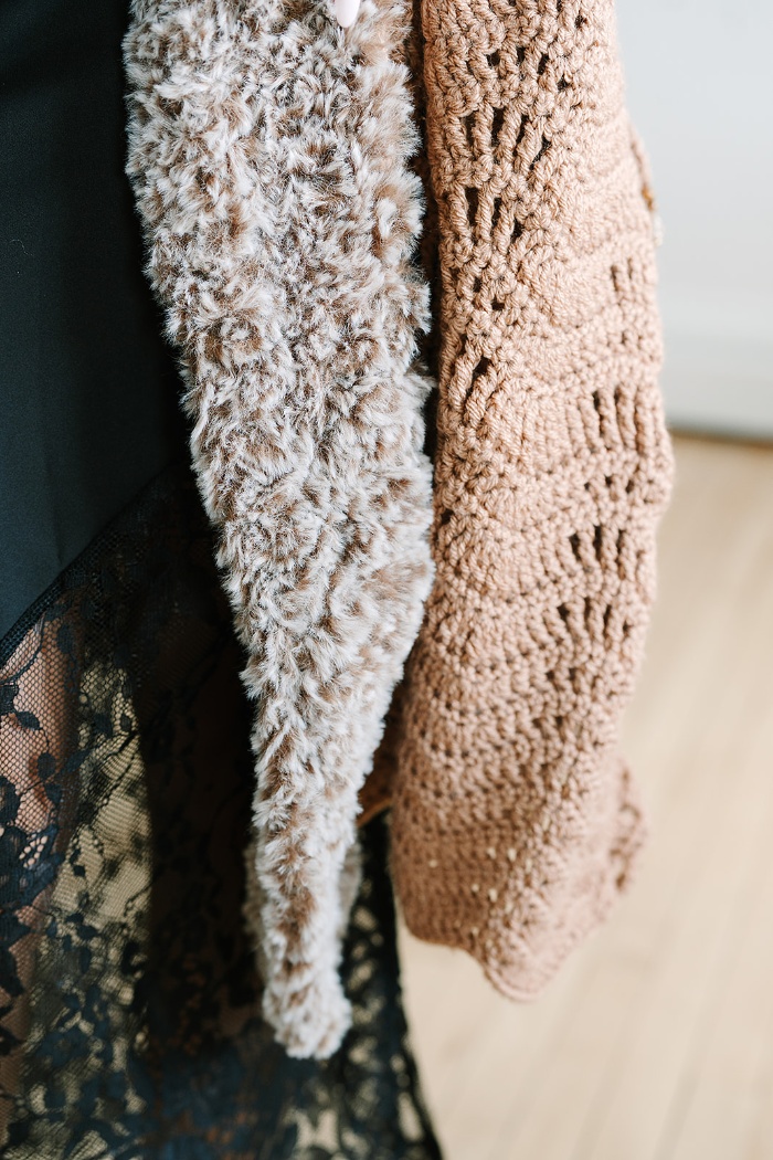 Main garment stitched with smaller hook. Fur cuff is stitched with larger hook.