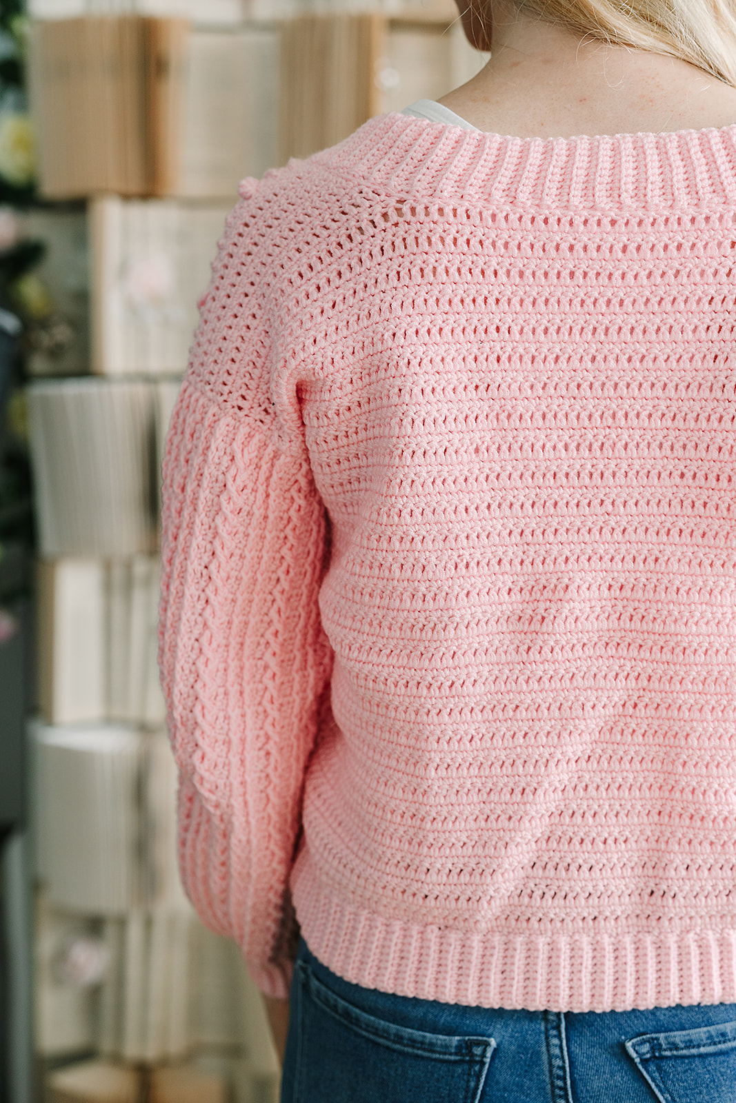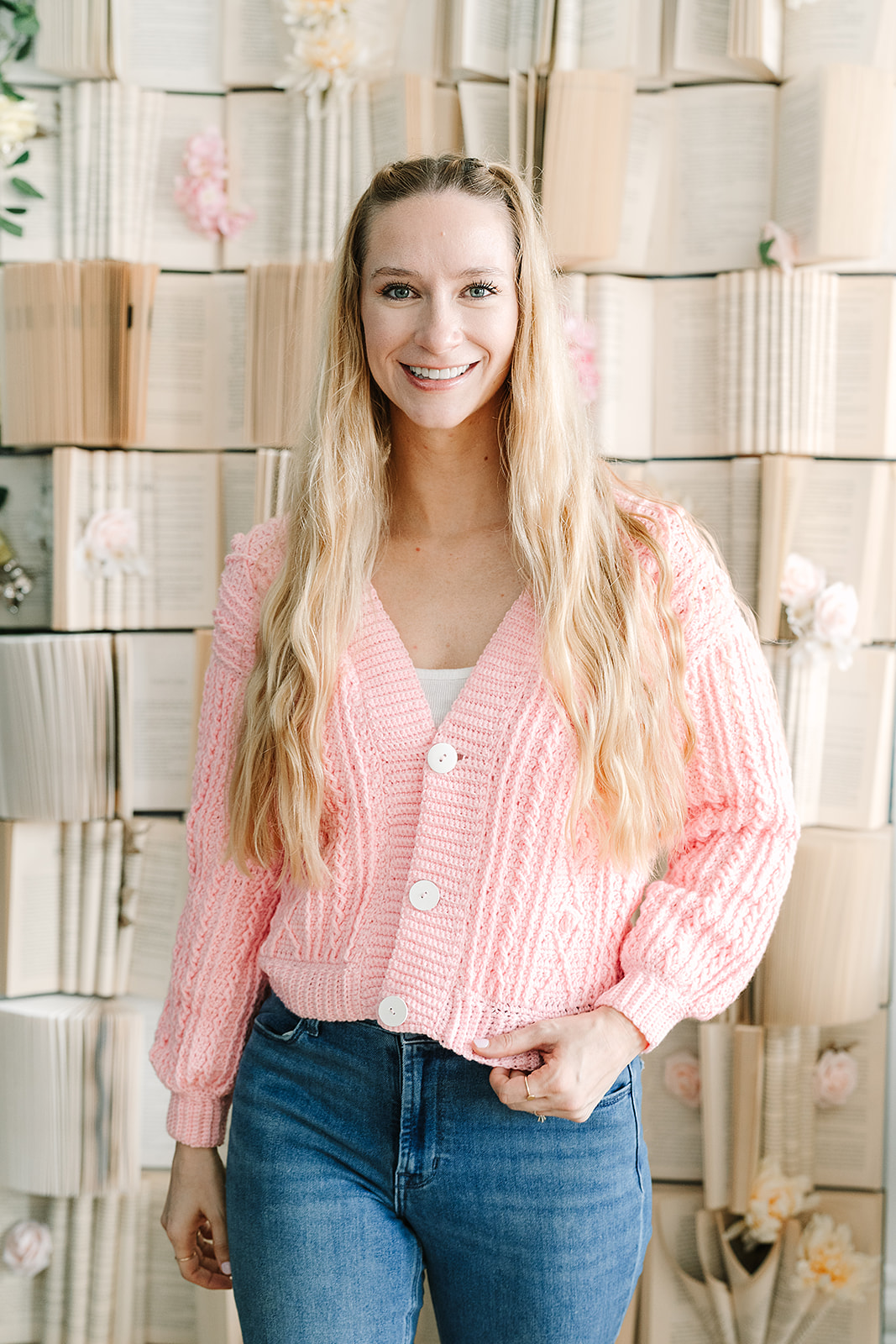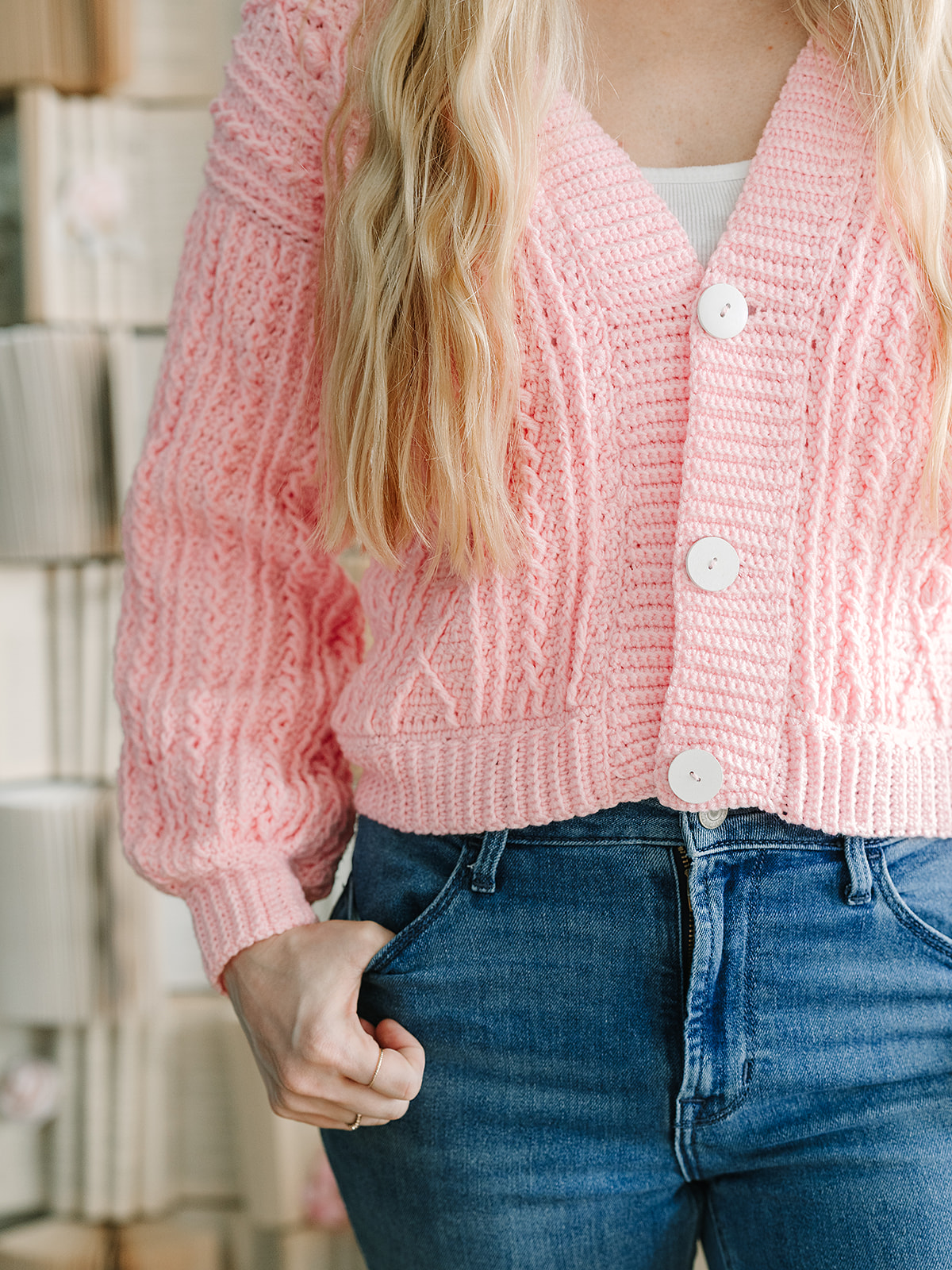 Add delicious texture to your wardrobe with the Pink Twist Cardigan. Crocheted in a soft baby pink, this cropped cardigan features beautifully intricate cabling throughout, creating a rich, tactile design that’s both cozy and elegant. Its flattering cropped silhouette makes it perfect for layering over dresses, skirts or high-waisted jeans, while the classic cable details give it a timeless, sophisticated look. This versatile piece is ideal for spring, cool summer evenings or adding a touch of warmth and style to any outfit.