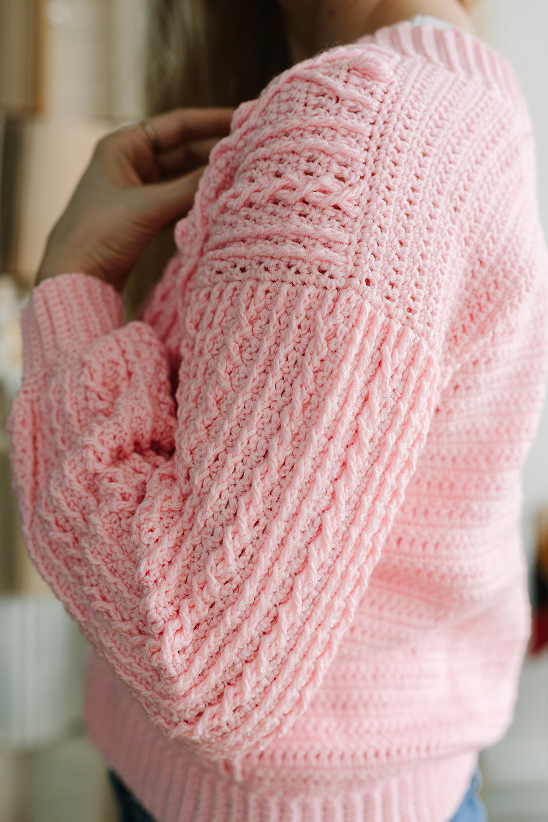 - The cable design appears only on the front part of the cardigan; the back section features only basic stitches, such as double crochet and single crochet, with no cables.
