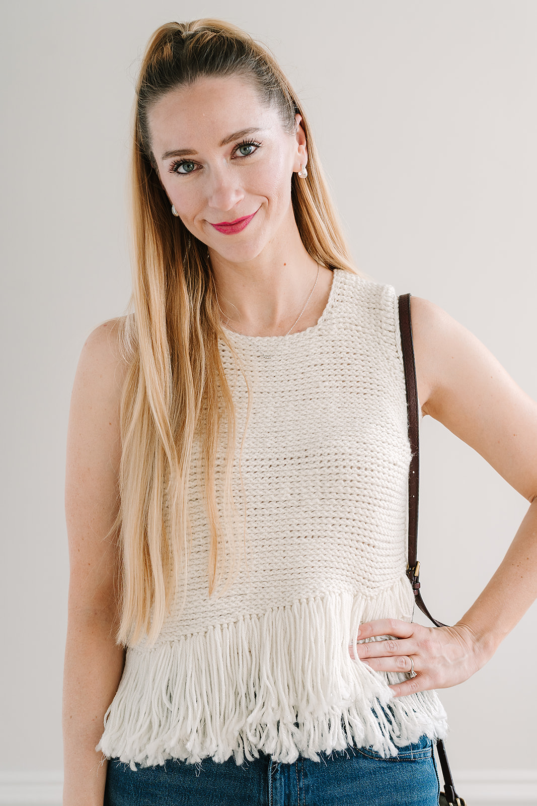 For front panel, work an additional row of fringes in a slanted position, extending 4-5 inches upward from one side of hem toward the hemline for a layered, angled effect.