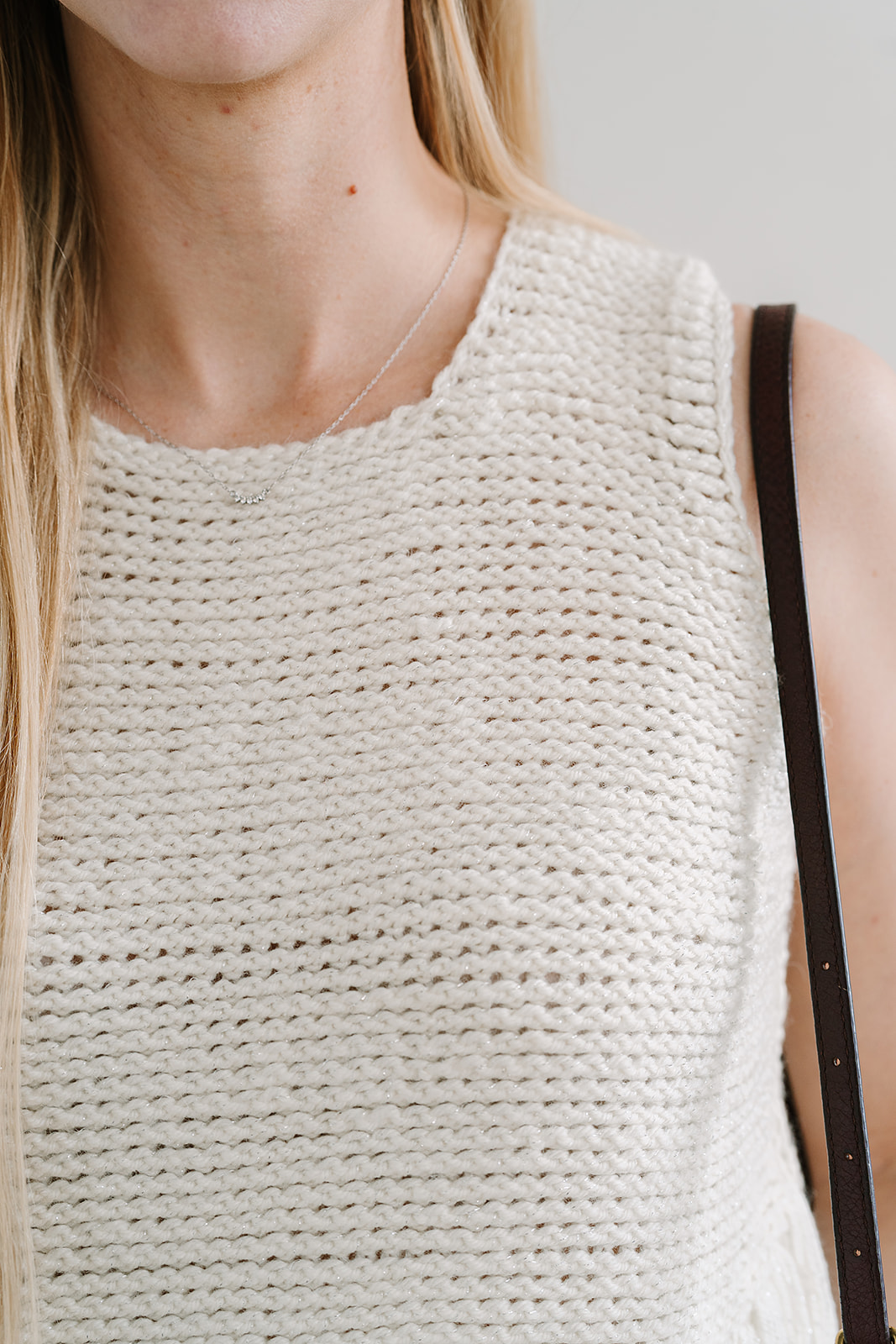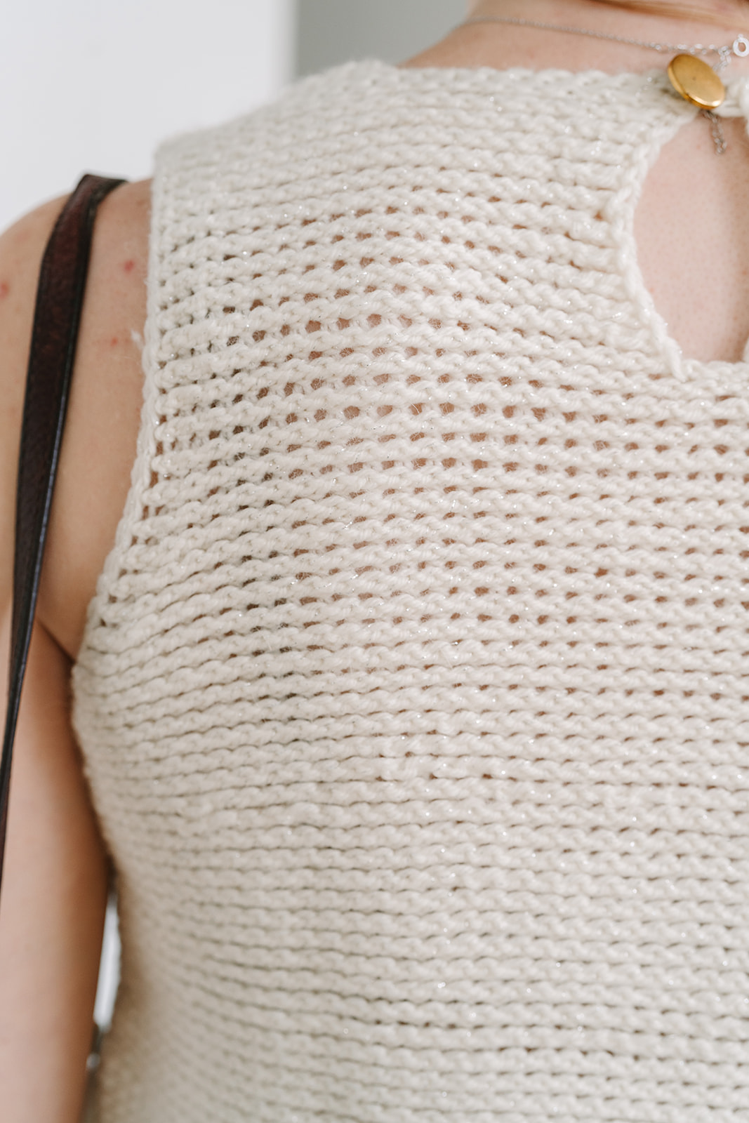 Decreases are worked at the beginning of the yoke for armhole shaping, with additional decreases and skipped stitches forming the round neckline on the front.