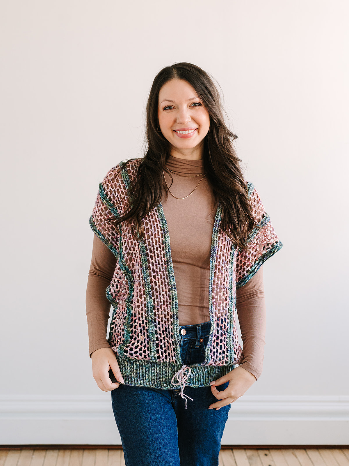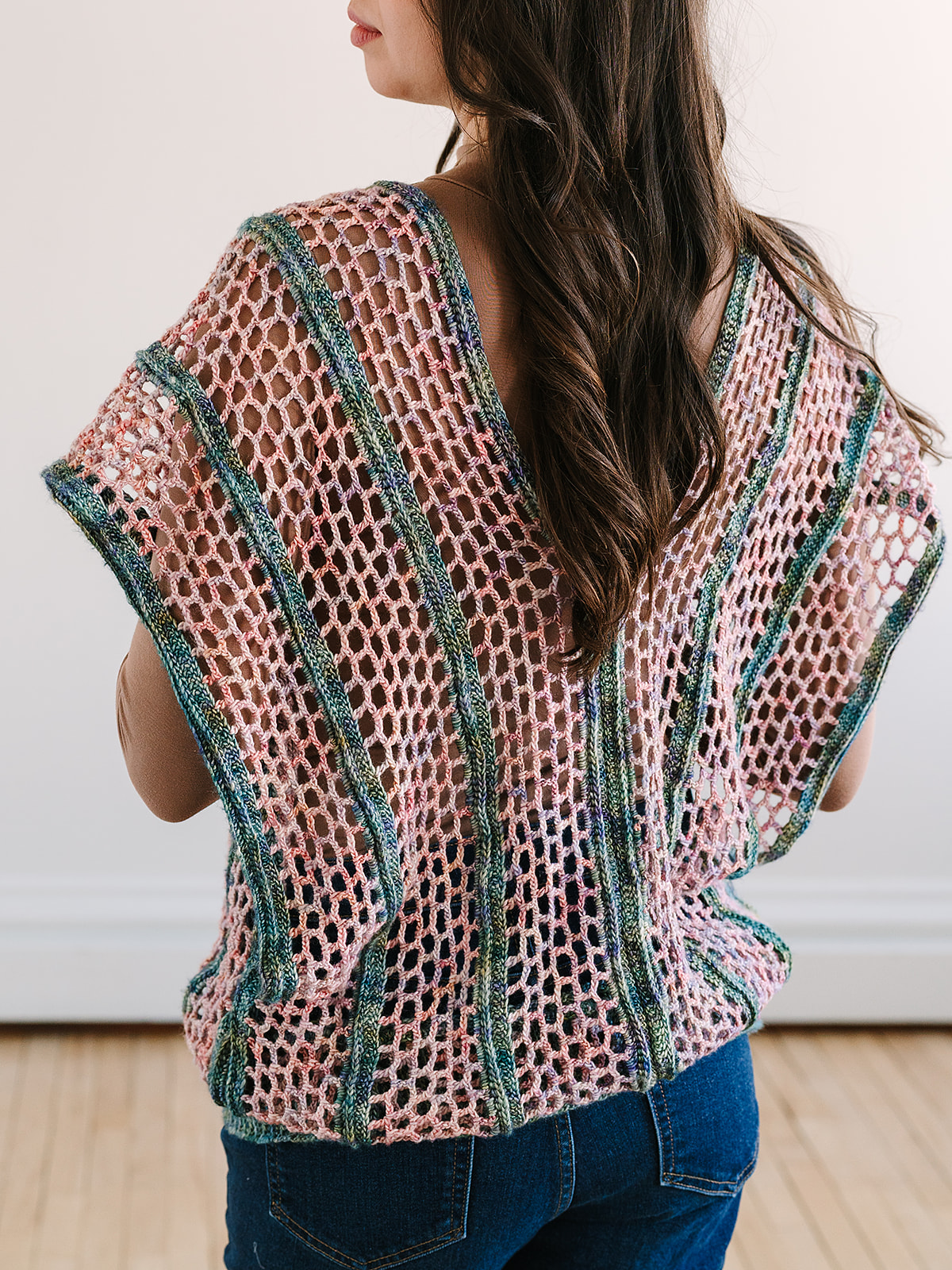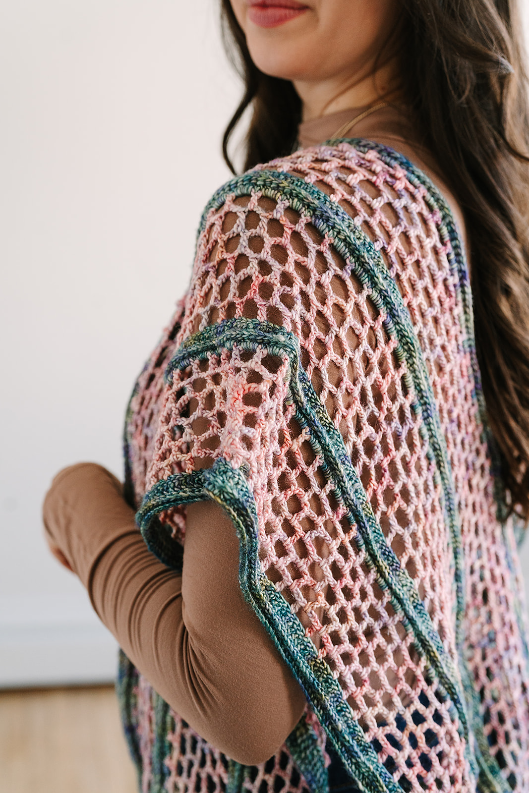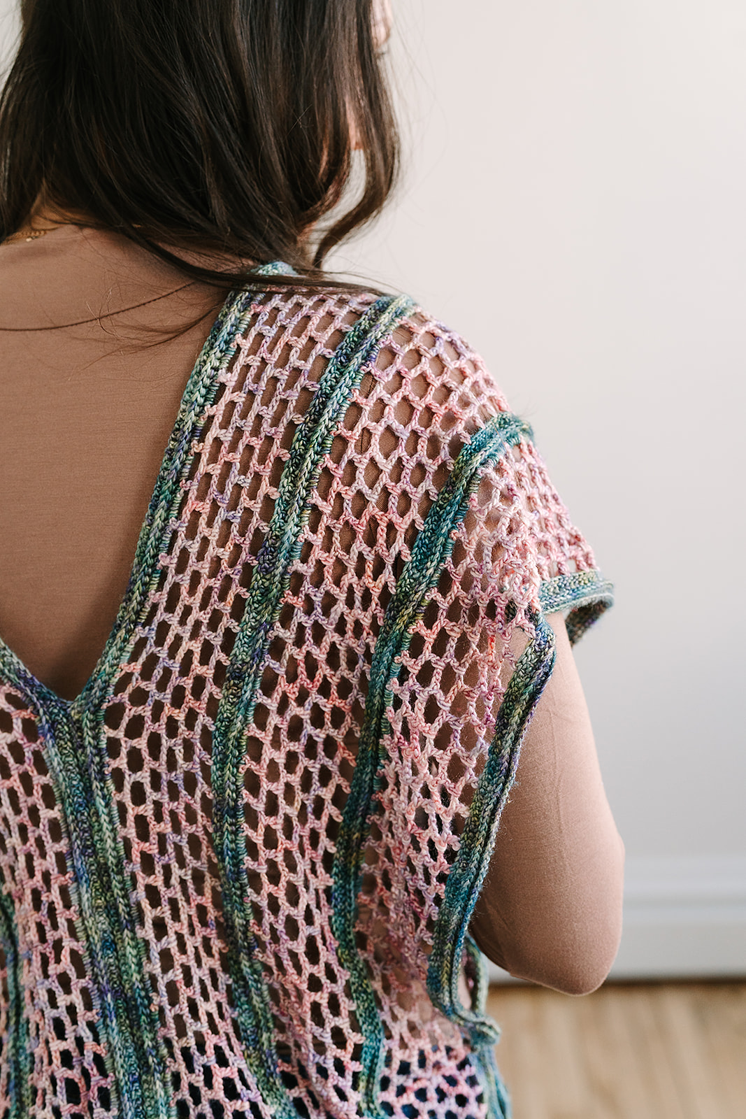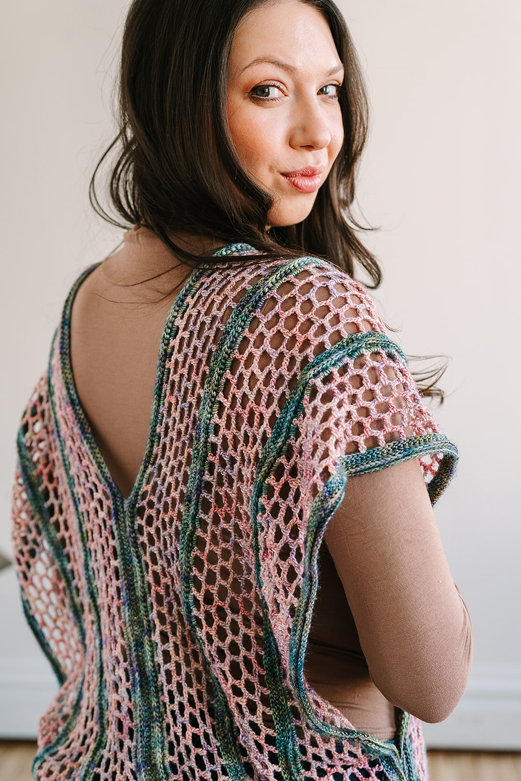 Meet the Twilight Mesh Top, a versatile layering piece for the changing seasons. Inspired by the dusky hues of a cool spring evening, this design features an airy fabric and a flowing silhouette created with two simple rectangles for an easy, enjoyable crochet experience. A cinched waistband gathers the fabric at just the right place, creating a billowing effect that is both flattering and comfortable. Wear it pinned at the front or open for a relaxed look that transitions effortlessly from day to evening.
