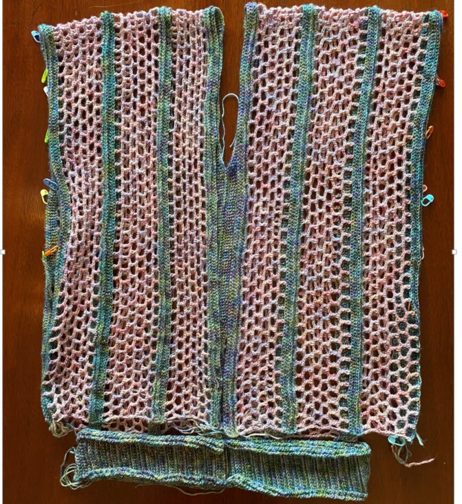 Yarn: Silky Merino from Malabrigo Yarn, Size 3 Light Weight, 4 oz Skeins of Indiecita, main color (MC) (purple and blues) and Rosalinda, contrasting color (CC) (creamy pink). Indiecita 4 (4, 5, 5, 6), Rosalinda 3 (3, 4, 4, 5) skeins.
