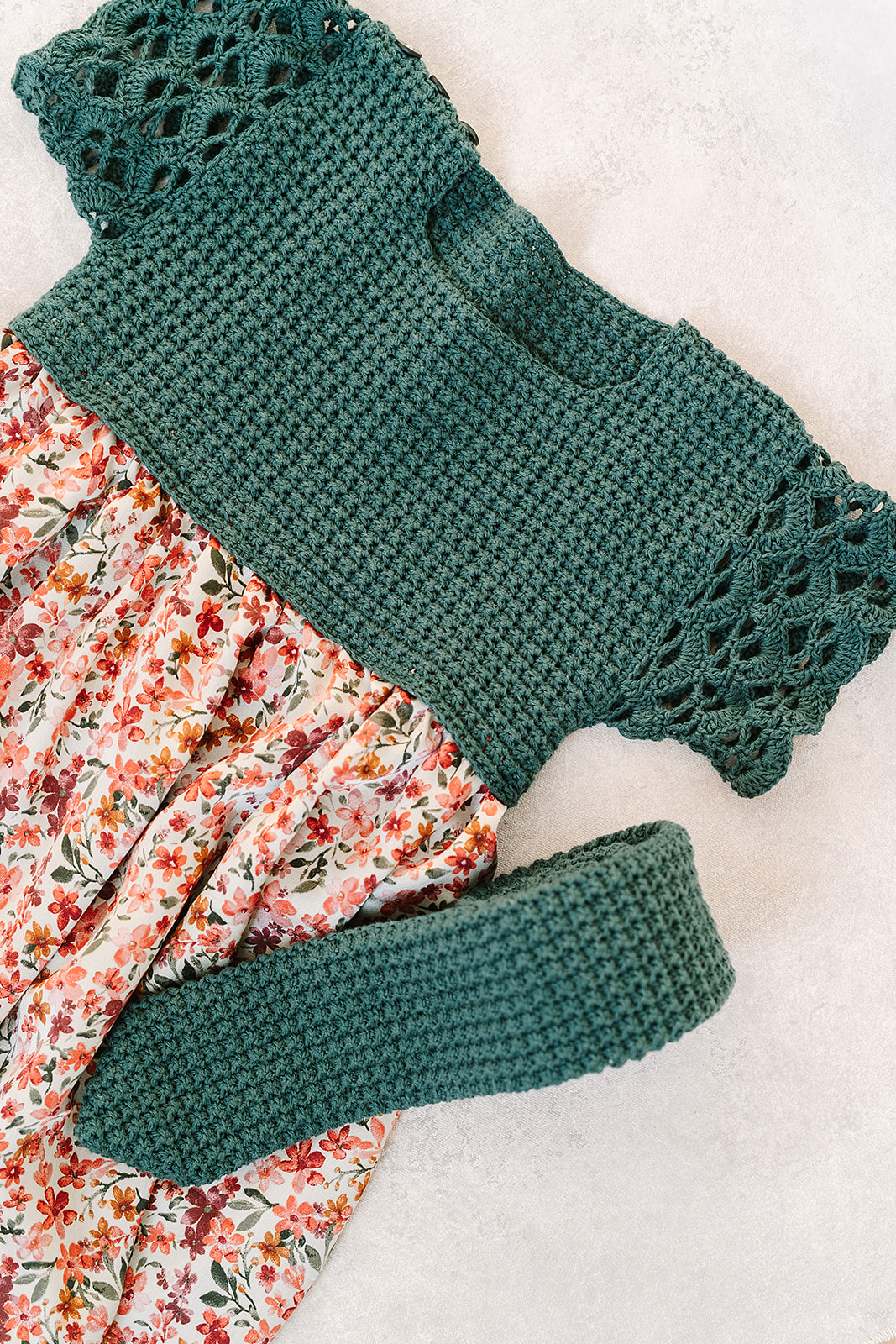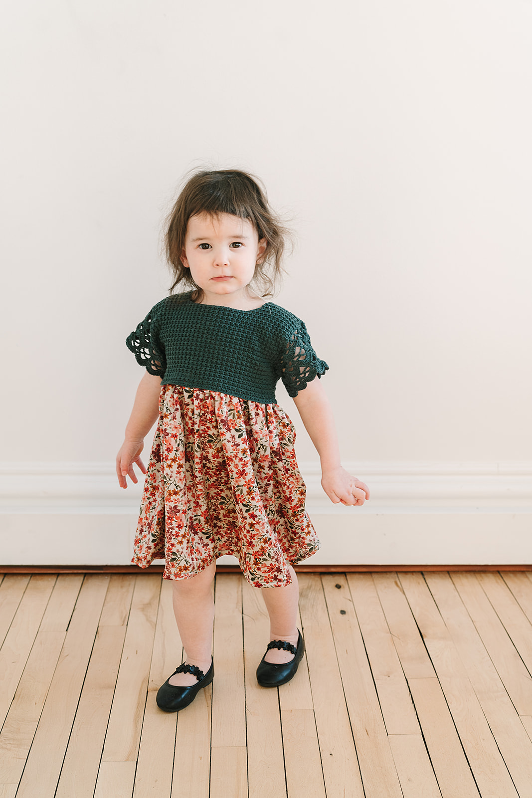 The bodice of the dress is worked flat in textured Trinity stitch. After sewing up the side and shoulder seams, the sleeves worked top-down, in the round. The fabric skirt is sewn to the bodice using sewing machine.