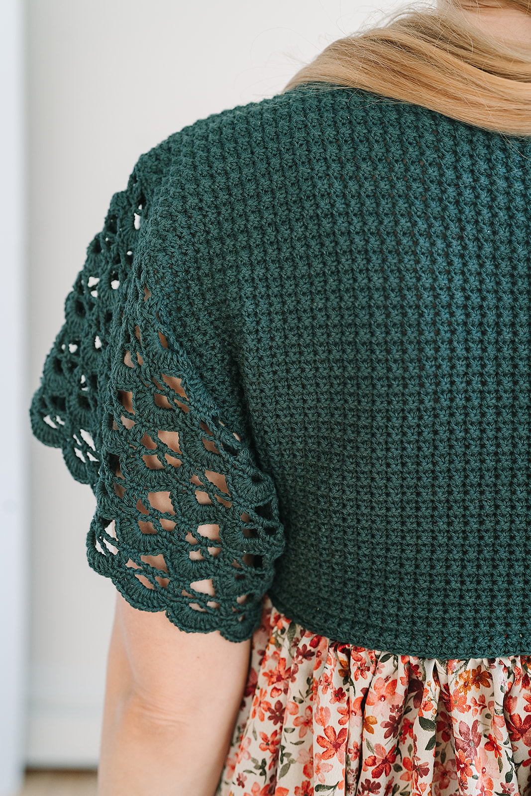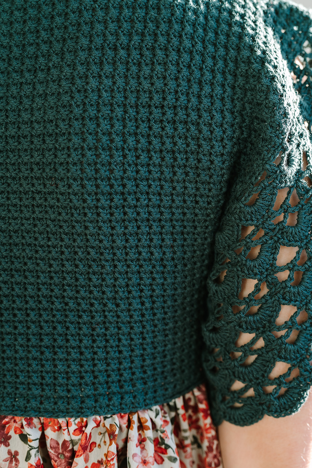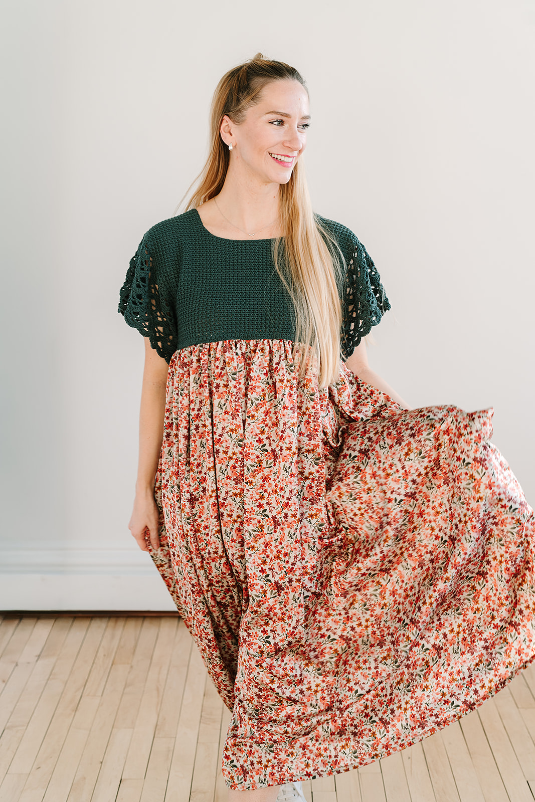 Meet the Trinity Bloom Dress, a beautiful crochet garment designed for adventurous beginners. Simple, boxy construction is balanced by delicate lace sleeves and a satin fabric with plenty of drape. Available in seven sizes, this dress also features a comfortable, maternity friendly fit.