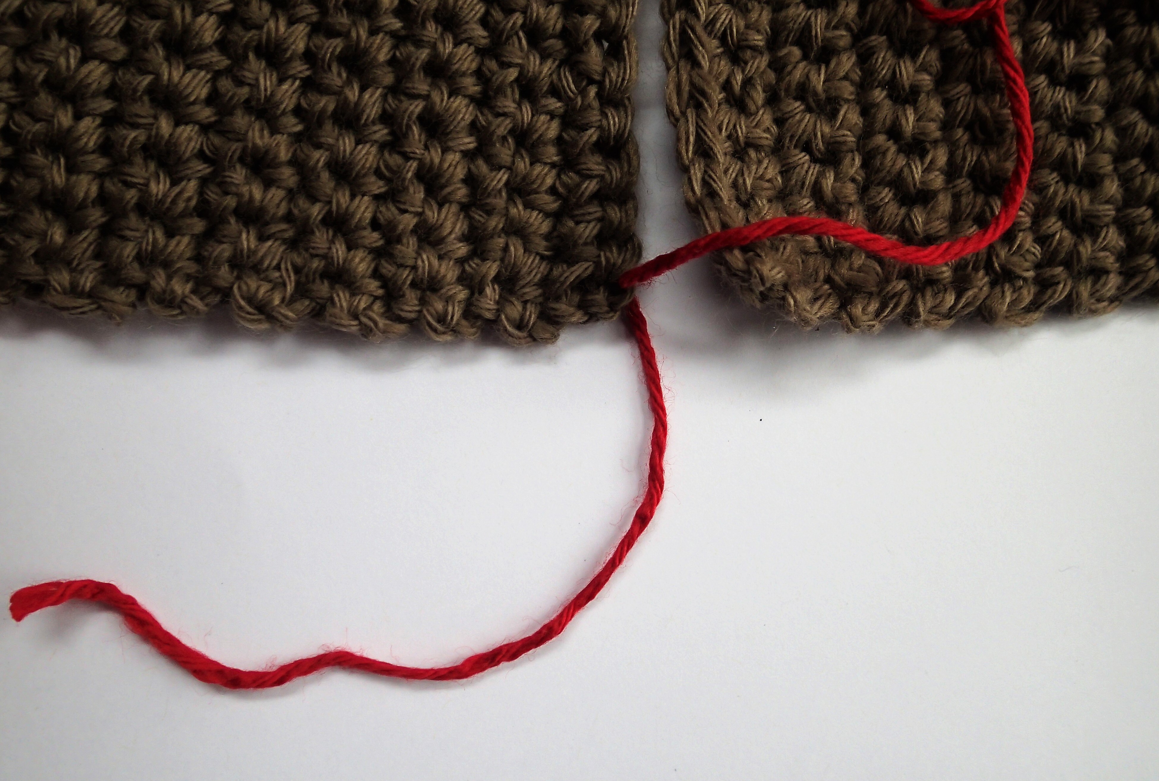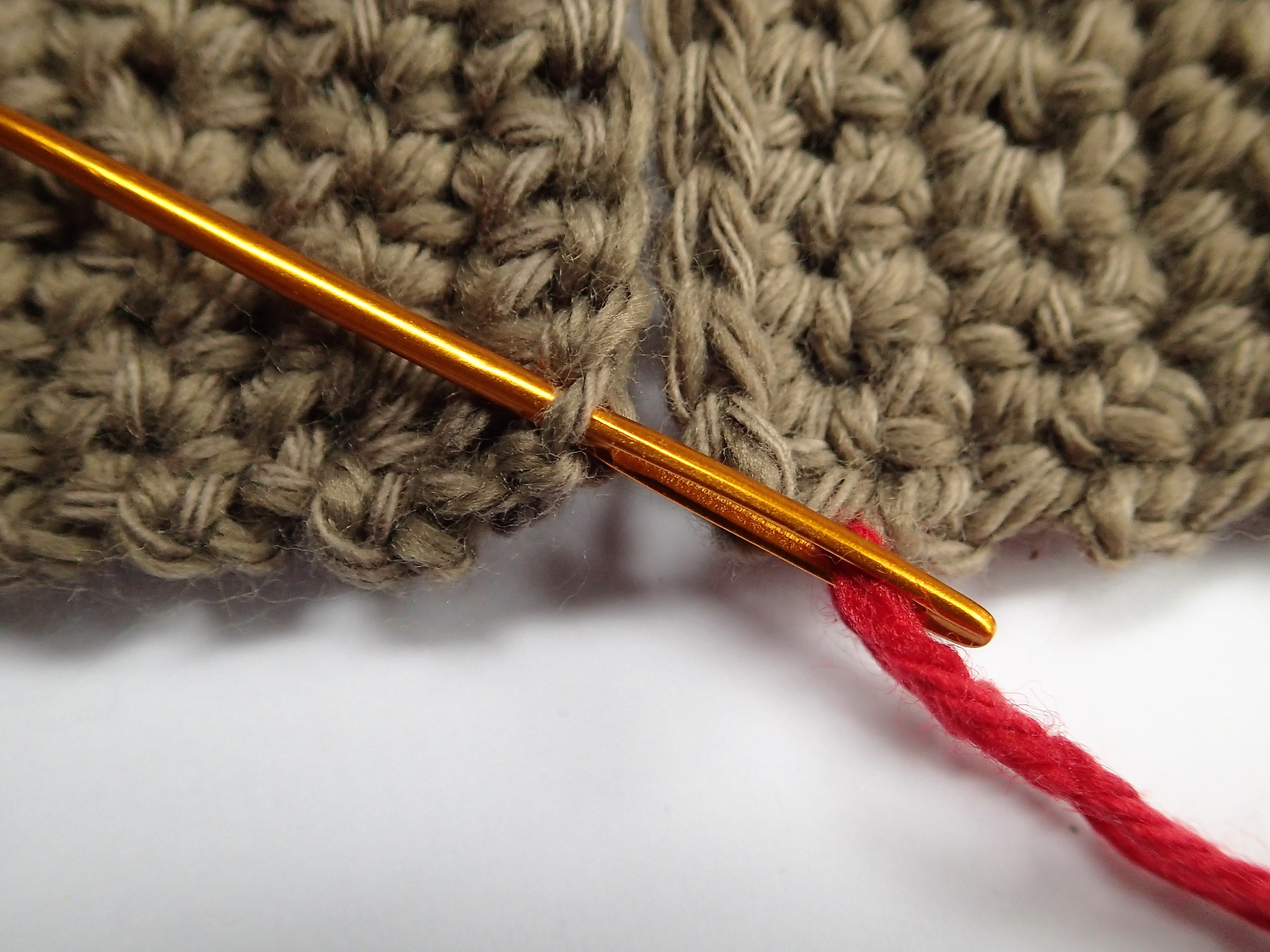 Step 4: Unpin the first few inches of work to be joined and match the edges on a flat surface. Starting at an edge, insert your needle from the bottom of the work up through the front loop only of the first stitch on one piece. The front loop of the stitch will be the outermost loop facing you.