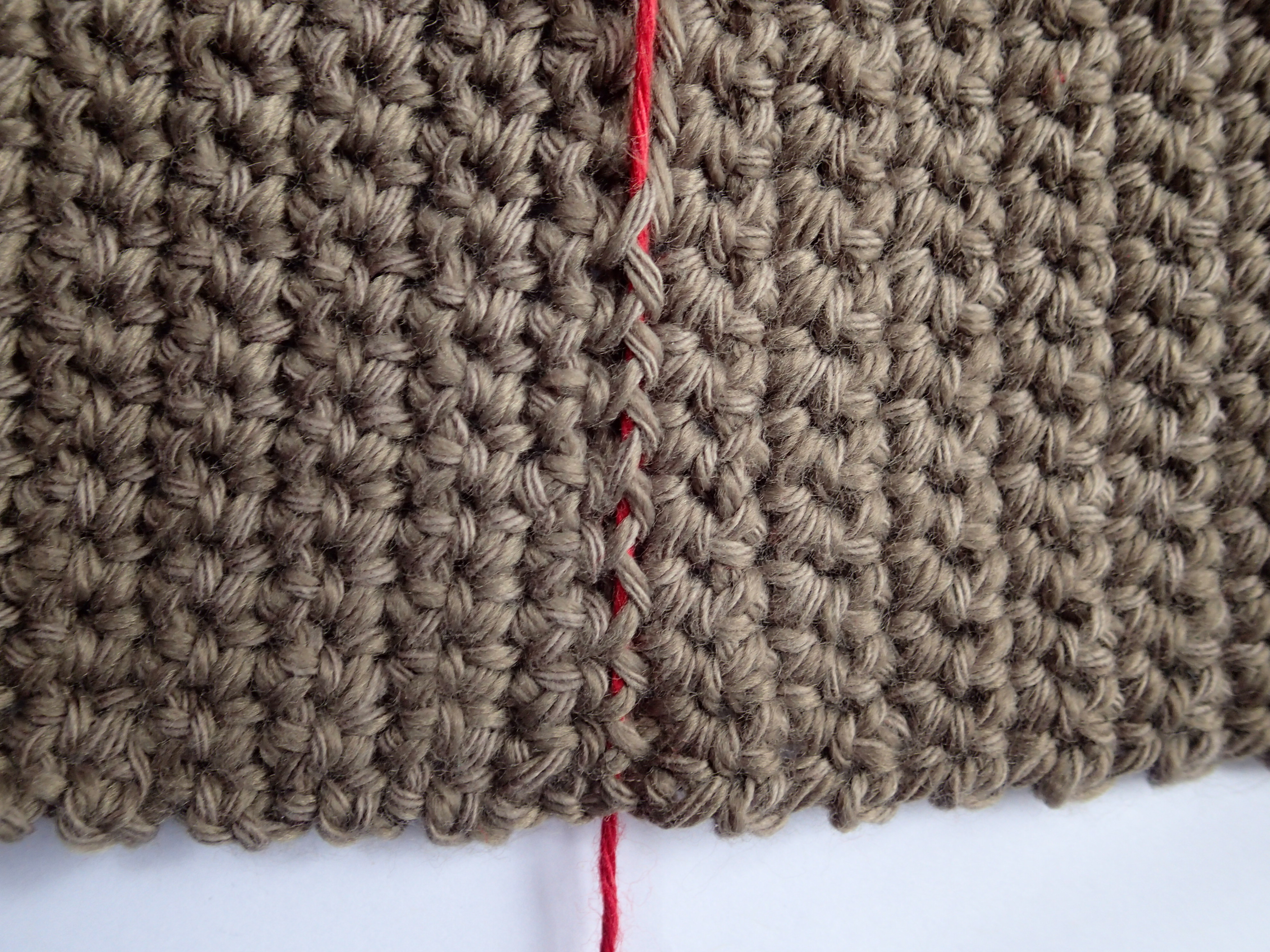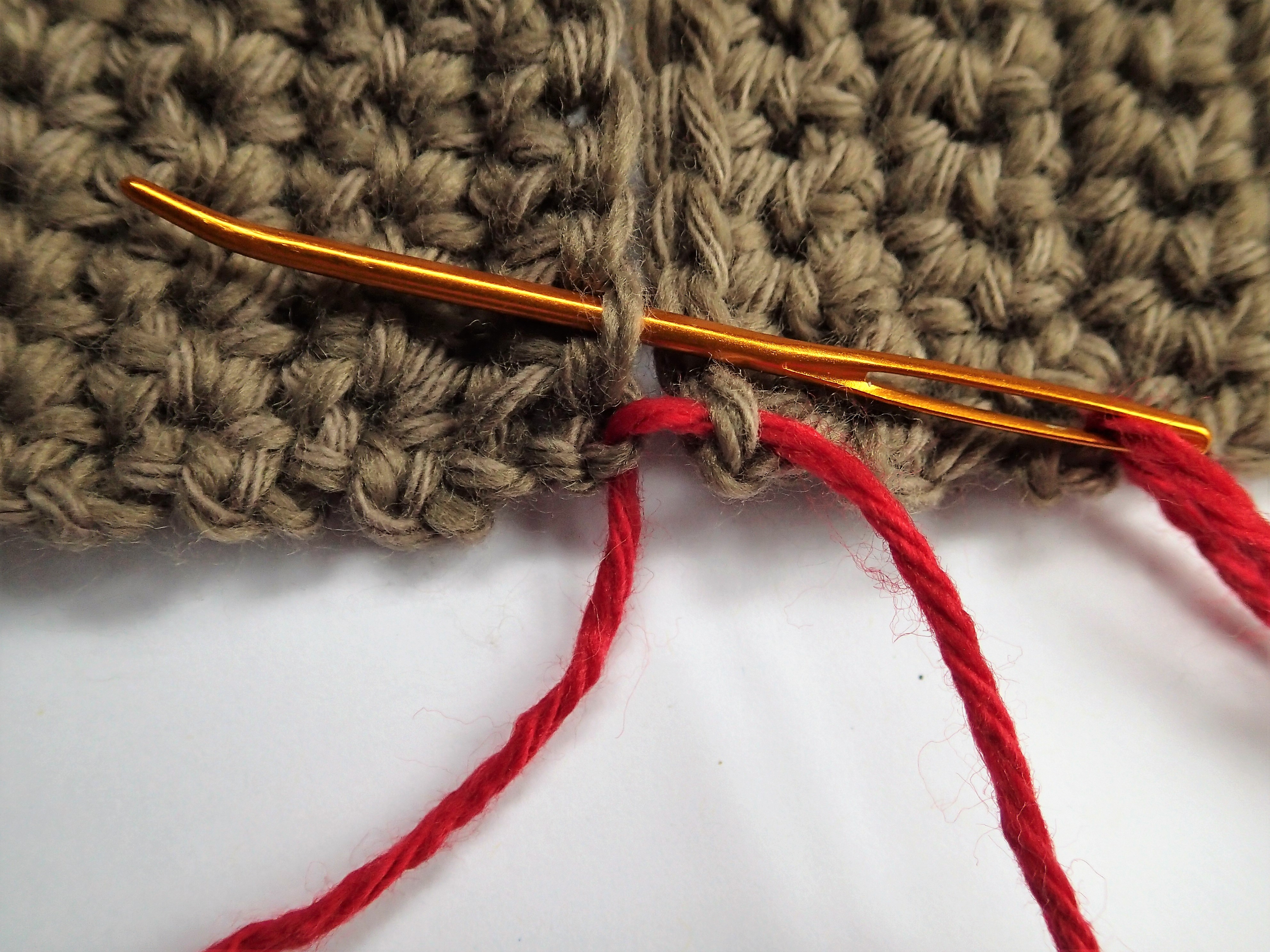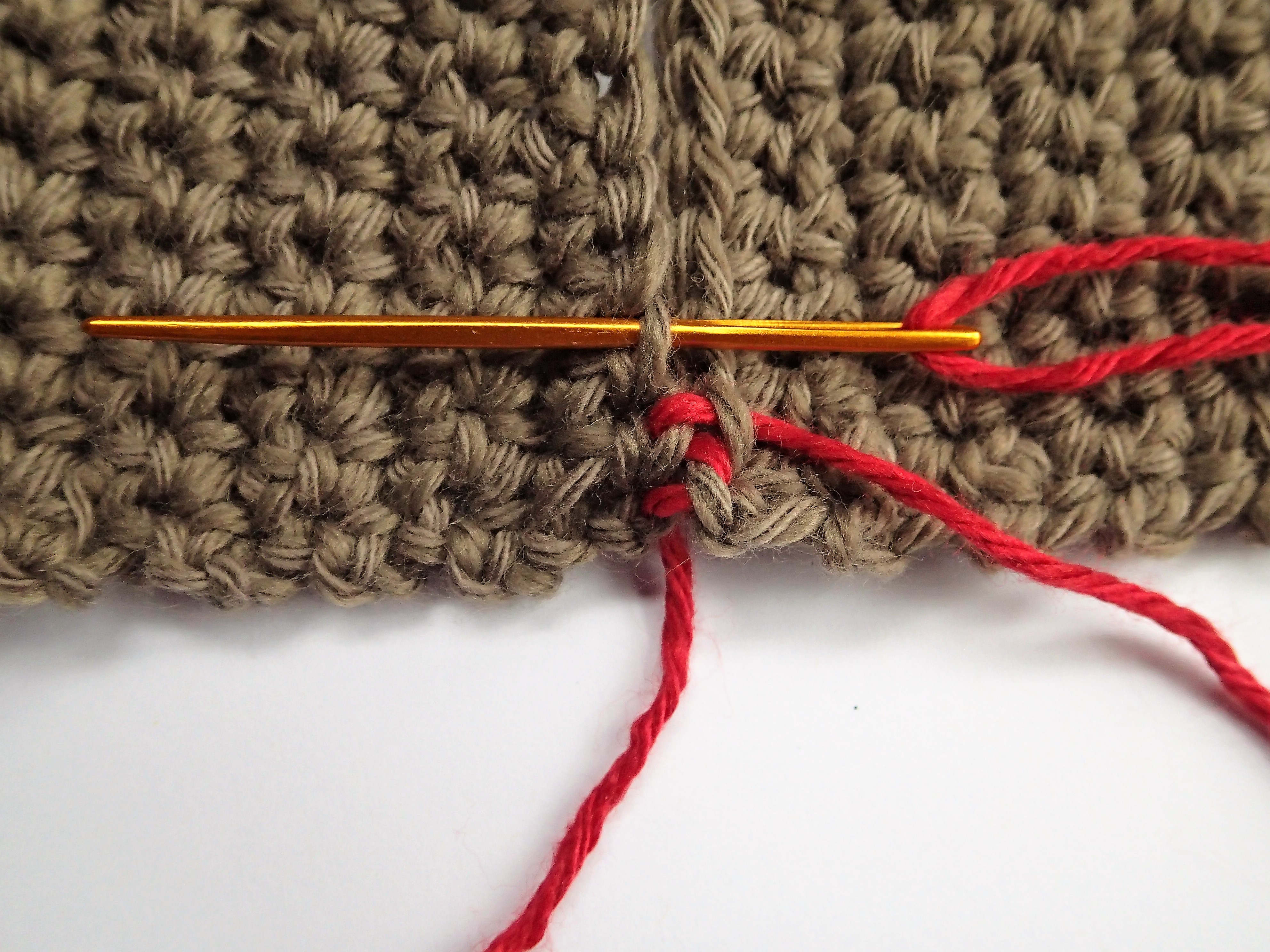 Step 4: Unpin the first few inches of work to be joined and match the edges on a flat surface. Starting at an edge, insert your needle from the bottom of the work up through the front loop only of the first stitch on one piece. The front loop of the stitch will be the outermost loop facing you.